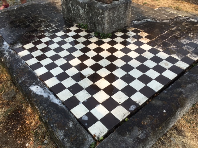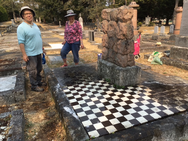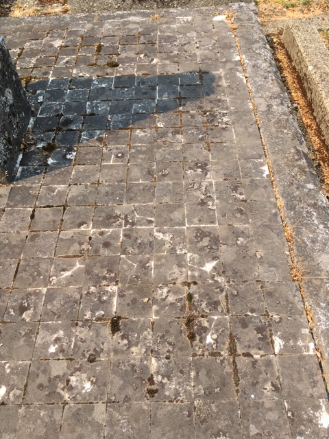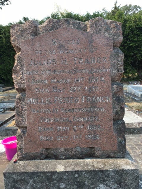 Laura Rosenberg and Andy Muchin joined Amber Woods at the cemetery to clean the Franck grave of Mollie and Julius Franck. Laura and Andy began by cleaning the headstone while Amber removed bits of moss from the ledger stone. Laura continued to work on the headstone while Andy and Amber used dish detergent and water on the ledger stone. When she was finished, Laura became the water bearer bringing water in a small bucket from the sink to the grave site. Slowly the tiles began to emerge from their cocoon of schmutz which has been building up for decades.