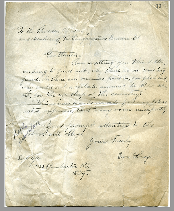 In 1982 the newly appointed Rabbi Victor Reinstein of Congregation Emanu-El created the Chevrah Kadisha (Jewish ritual burial society) with Michael Goldberg as the chair. Rabbi Victor and Harry Brown were the Cemetery Committee for several years and created policies which still exist. The Cemetery Committee is now a sub-committee of the Board of Congregation Emanu-El. The Cemetery Trust fund continues to exists as a separate organization which helps to fund special projects and holds the reserve funds for perpetual care when the cemetery is full.