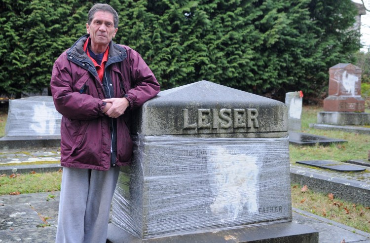 On December 30, 2011, the caretaker, Geoffrey, discovered that 5 graves had been desecrated. Some were spray painted with swastikas, one had been defaced with a white power symbol as well as with the words “Jewish scum.” As the monuments were being cleaned, they were wrapped in a see through cloth which made them look like they had been wounded in battle.