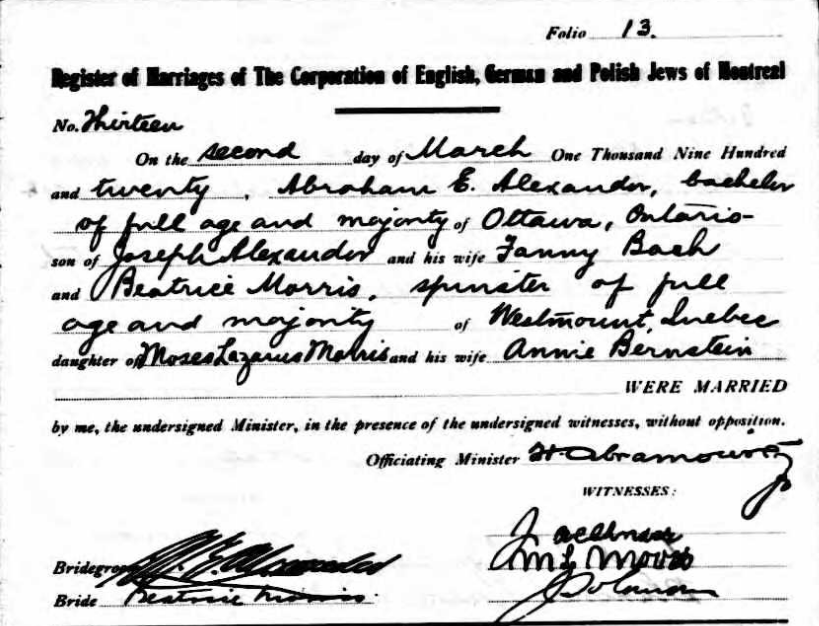 On Tuesday March 2, 1920, A.E. married Beatrice Morris, daughter of the Russian born clothing merchant Moses L. Morris. The wedding took place at Beatrice’s home in Westmount with Rabbi Abramovitz and Rev Siegel of the Reform Congregation Shar Hashonym officiating. A.E.’s brother A.J had married Beatrice’s older sister Bessie on June 8, 1904.