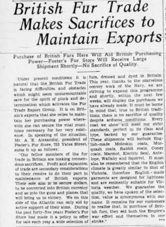 “Our fellow members of the fur trade in Britain are making tremendous sacrifices. Profit and expansion of trade are secondary considerations to their resolve to do their part in maintenance of British exports. Their sole aim is to secure dollars to be converted into British currency and so into the guns and planes that will bring us to victory. We on this side of the Atlantic can only aid by active support of heir aims. During the past 45 years Foster’s Fur Store has made it a policy to offer for sale each year a wide selection of furs dressed and dyed in Britain. This year thanks to the marvellous convoy work of the Navy, we are striving to expand this programme and shortly, within the next few weeks will display the purchases we have already made. It must be borne in mind that, true to British traditions, there is no sacrifice of quality despite arduous conditions. Every coat we show will meet our strict standards, perfect in it’s class and type, backed by our guarantee. These shipments will include English nae Moleskin cots, Musquash coats, Rabbit coats, Coney coats Marmot, Electric Seal, Antelope, Wallaby and Squirrel. It must also be remembered that the English climate is greatly similar to that of Victoria, therefore, English made garments are designed for lightness and are eminently suitable for Victoria weather. We guarantee the quality, we have spoke of the selection value is synonymous with our name. It means for our customers to realize that, in purchase of British made furs they aid both the Empire’s war effort and themselves.”