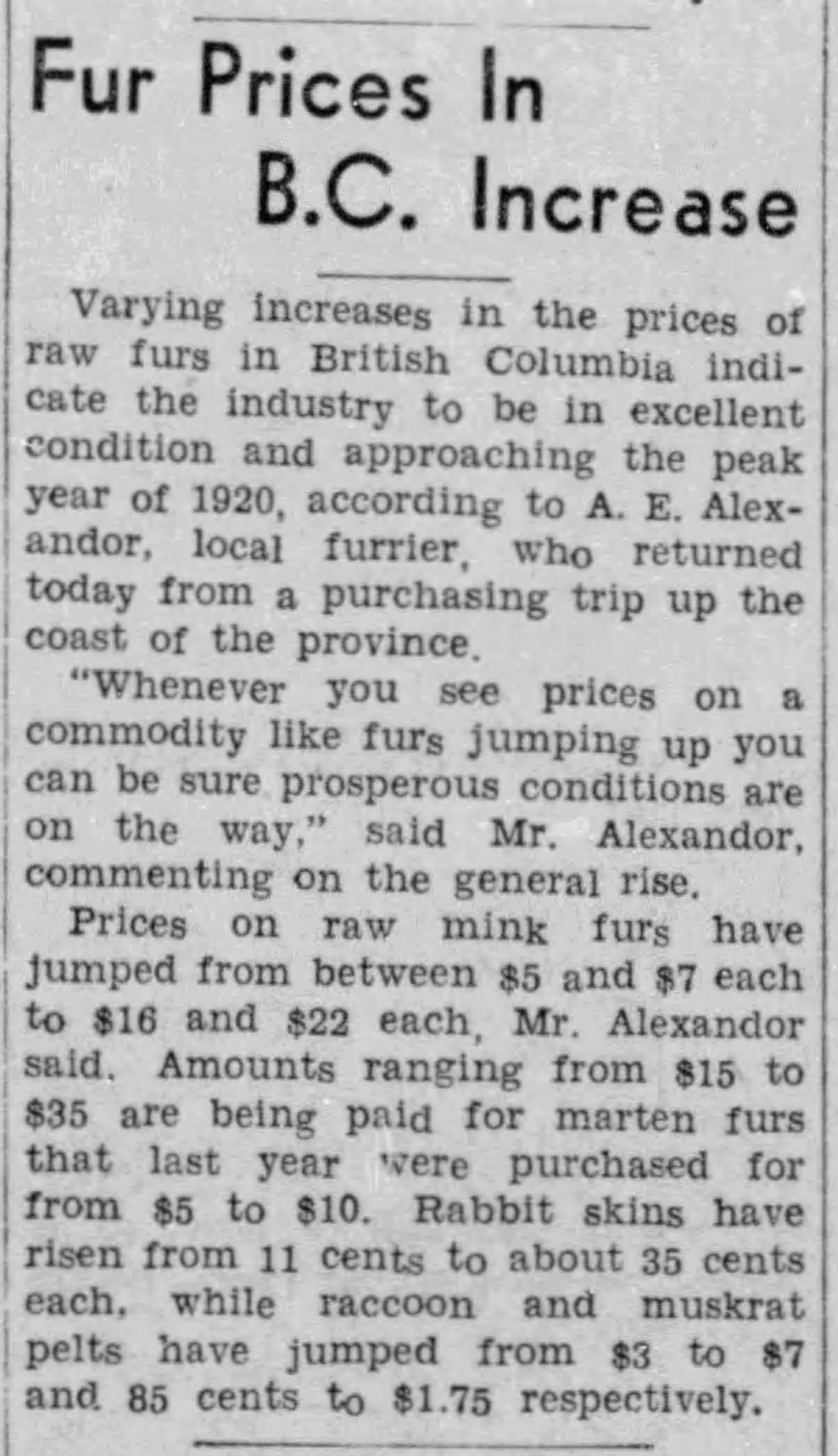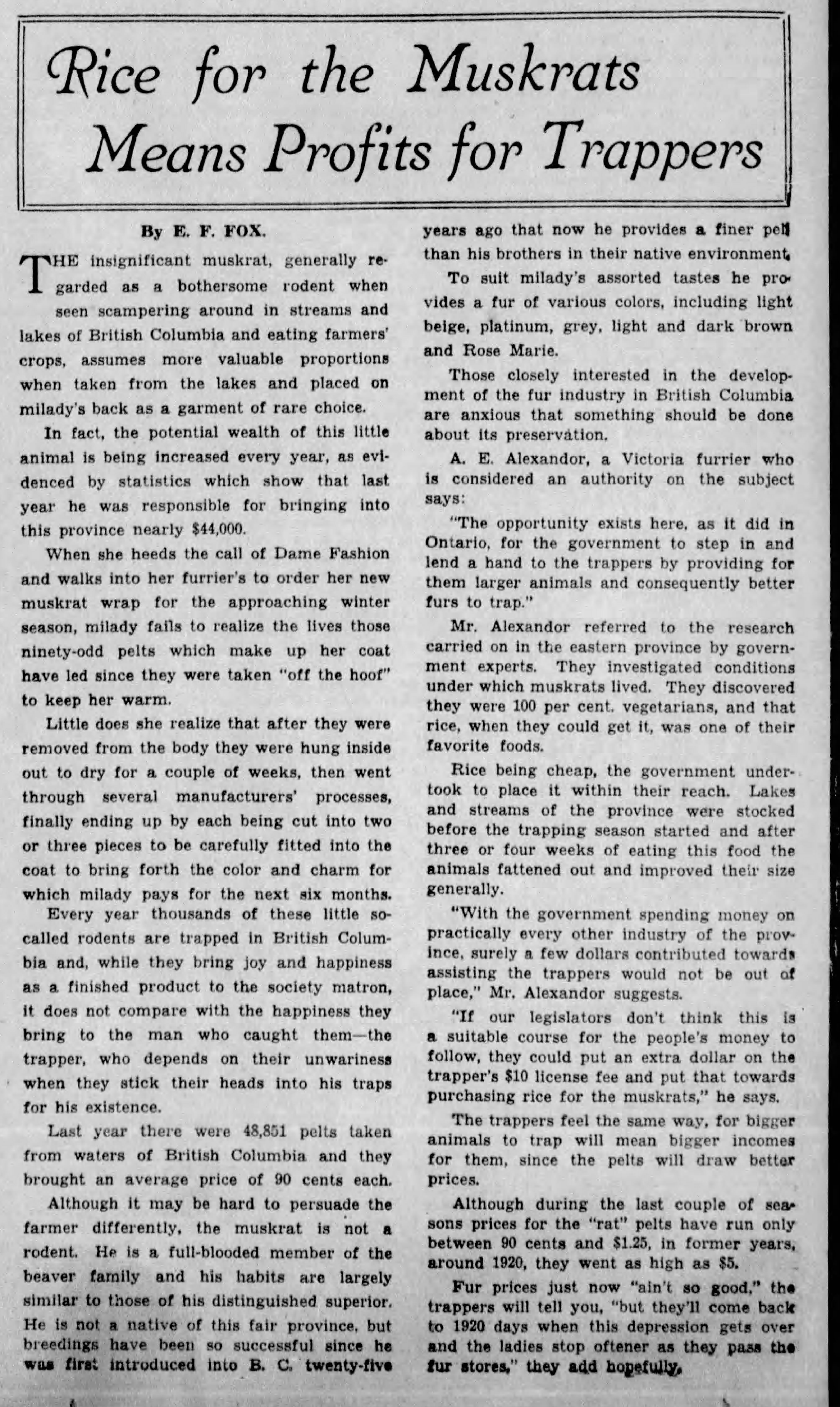 A.E. Alexandor, a Victoria furrier who is considered an authority on the subject said: “The opportunity exists here, as it did in Ontario for the government to step in and lend a hand to the trappers by providing for them larger animals and consequently better furs to trap. With the government spending money on practically every other industry of the province surely a few dollars contributed towards assisting the trappers would not be out of place Although during the last couple of seasons prices for the ‘rat’ pelts have run only between 90 cents and $1.25 in former years around 1920 they went as high as $5. Fur prices now ‘ain’t so good’ the trappers tell you, “but they’ll come back to 1920 days when this depression gets over and the ladies stop oftener as they pass the fur stores.”
