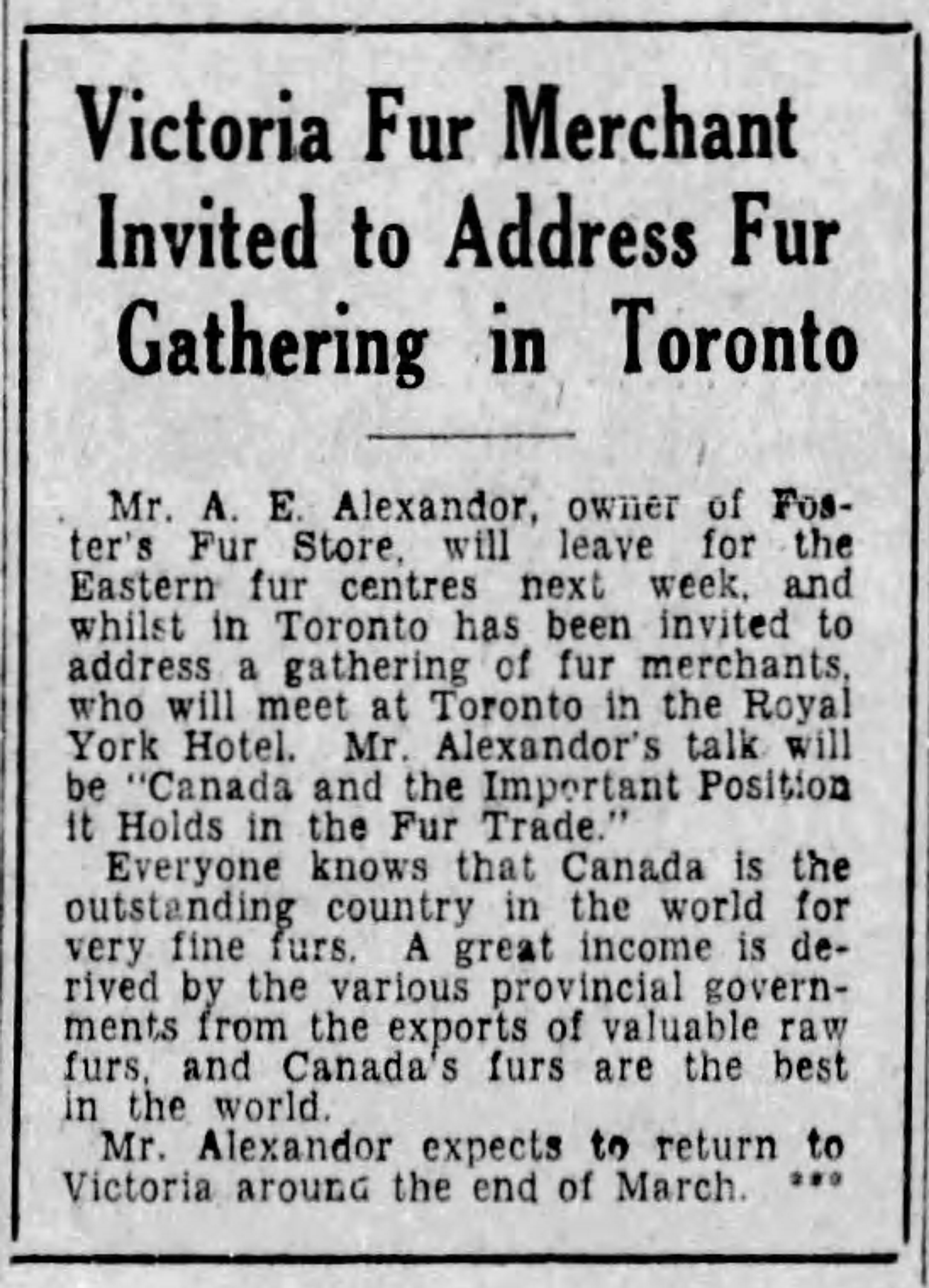 A.E. was also able to use the press to his advantage. The Times Colonist on February 26, 1932, and the Victoria Daily Times on February 27, 1932 both reported that A.E. would be leaving Victoria for a month-long business trip to Eastern fur centers. As part of the trip, A.E. would be going to Toronto to give an address at a fur merchants’ conference held at the Royal York Hotel. A.E.’s speech was called “Canada and the Important Position it Holds in the Fur Trade.”