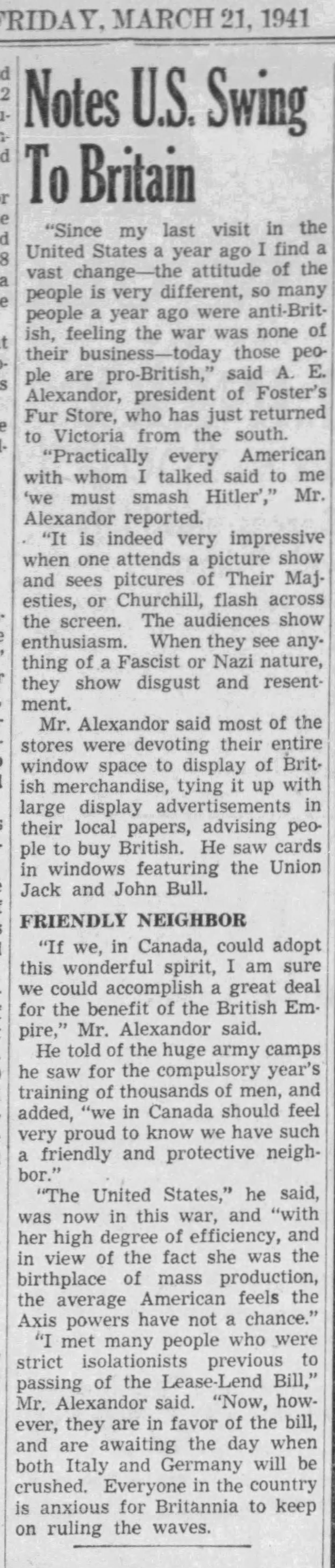 The Victoria Daily Times on November 9, 1945 recorded; “Mr A.E. Alexandor will be host to the staff of Foster’s Fur Store at dinner at the Empress Hotel tonight, followed by theatre party at the Royal Victoria Theatre. Later in the evening Mr. Alexandor leaves by T.C.A. plane to visit his daughter and son-in-law Mr and Mrs Harry Weiner at Longview, Washington.”
