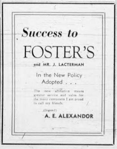 In September 1936, A.E. incorporated himself under the name Foster’s Fur Store (Victoria) Ltd. He registered the firm with himself President.