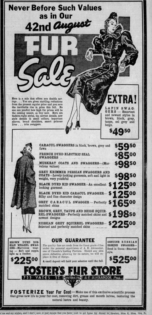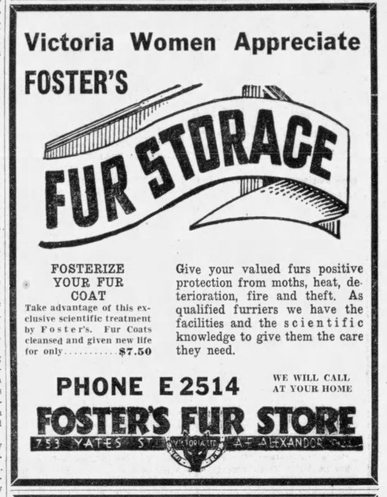 In 1936 A.E, introduced the idea of “Fosterizing” fur coats. He often advertised in the papers that “Fosterizing” was a scientific treatment that would add years to the life and loveliness of the coat by; cleaning fur and lining, removing all moth larvae, replacing oil on dried pelts to restore the original luster and provide greater resistance to damp weather and making it look like new. In 1936 the price for “Fosterizing” was $7.50, (roughly $160.00 US in 2023) and rose to $10.00 by 1947. A sample of the advertisements are above and more can be found on the Jewish Victoria website.