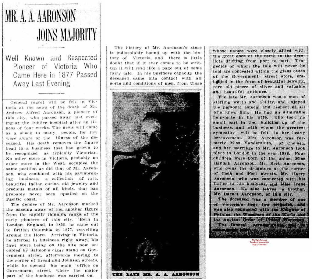 While in London, Aaronson married Rose Vandersluys (Vandersluin or Vandersluis). Rose, also from Chelsea was the child of an English mother and a Dutch father. Their eldest child, Hannah, was born in London in 1887. The family returned to Victoria in 1888 and established the Victorian Indian Curio Bazaar. Rose was instrumental in building that business and a full partner in operating it. A.A. Aaronson also continued to operate a pawn shop on Johnson. He was a flamboyant community figure and was often called Andy or “Uncle.”