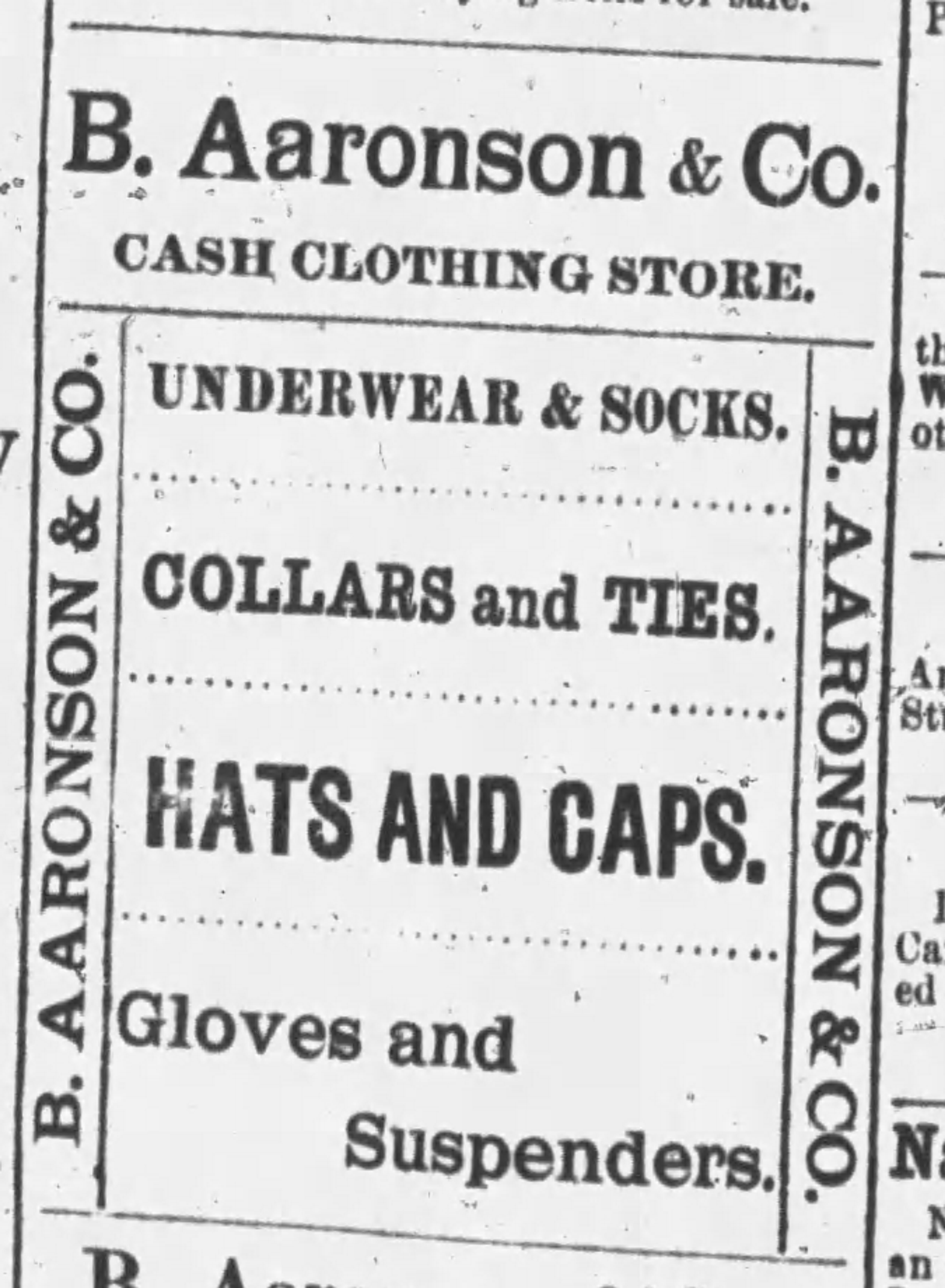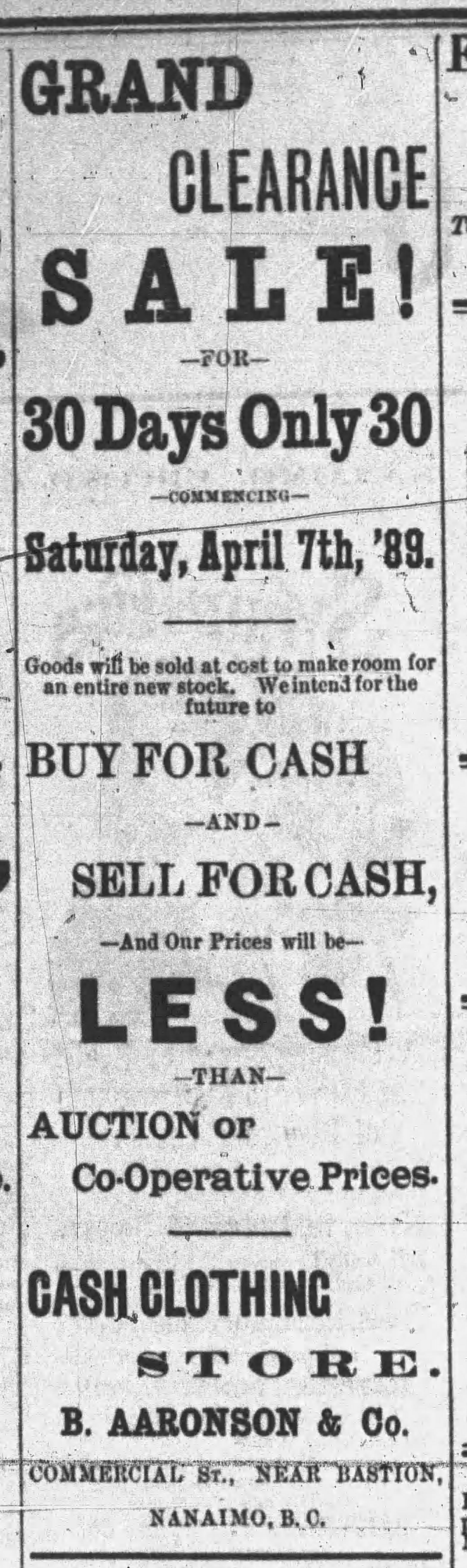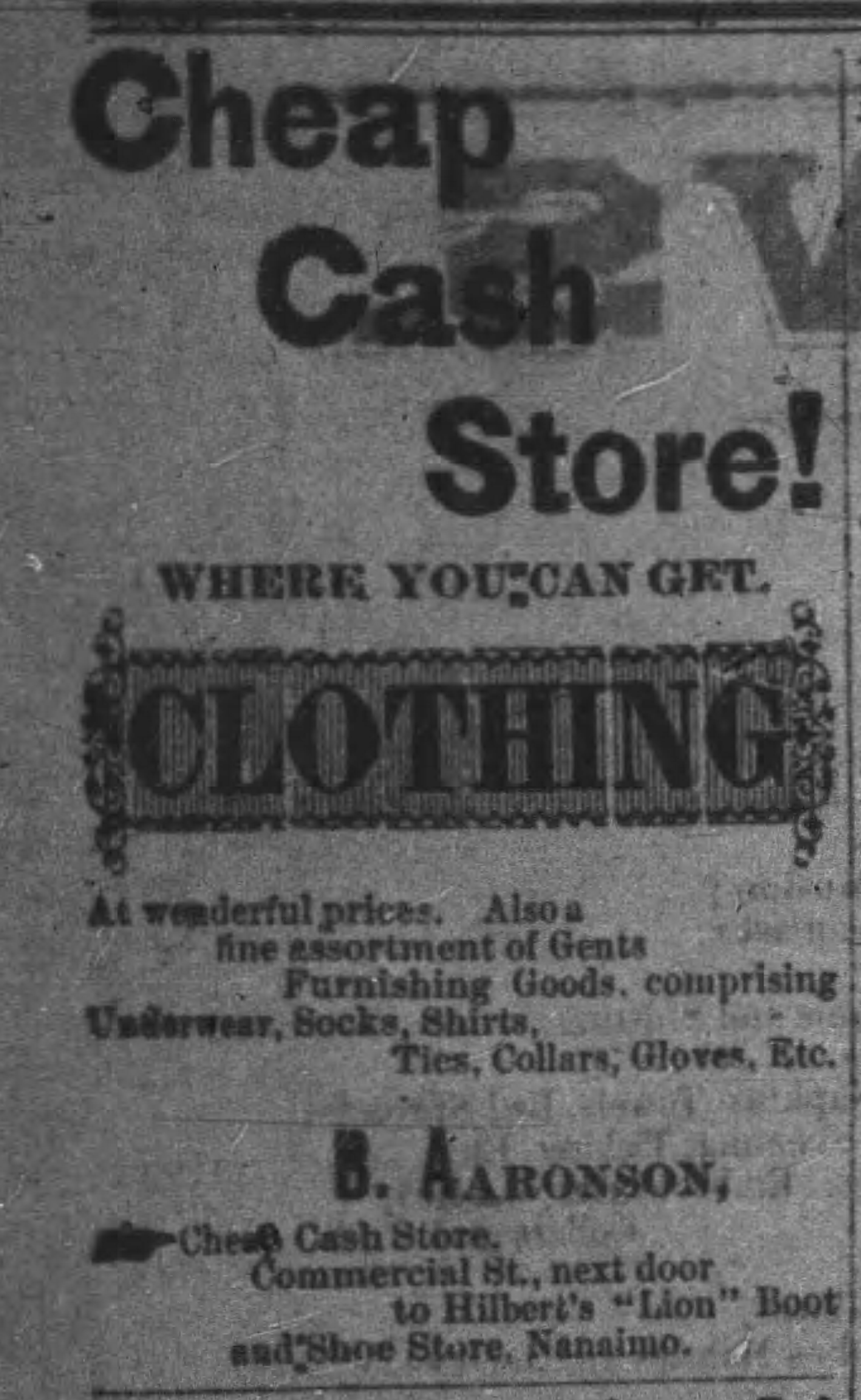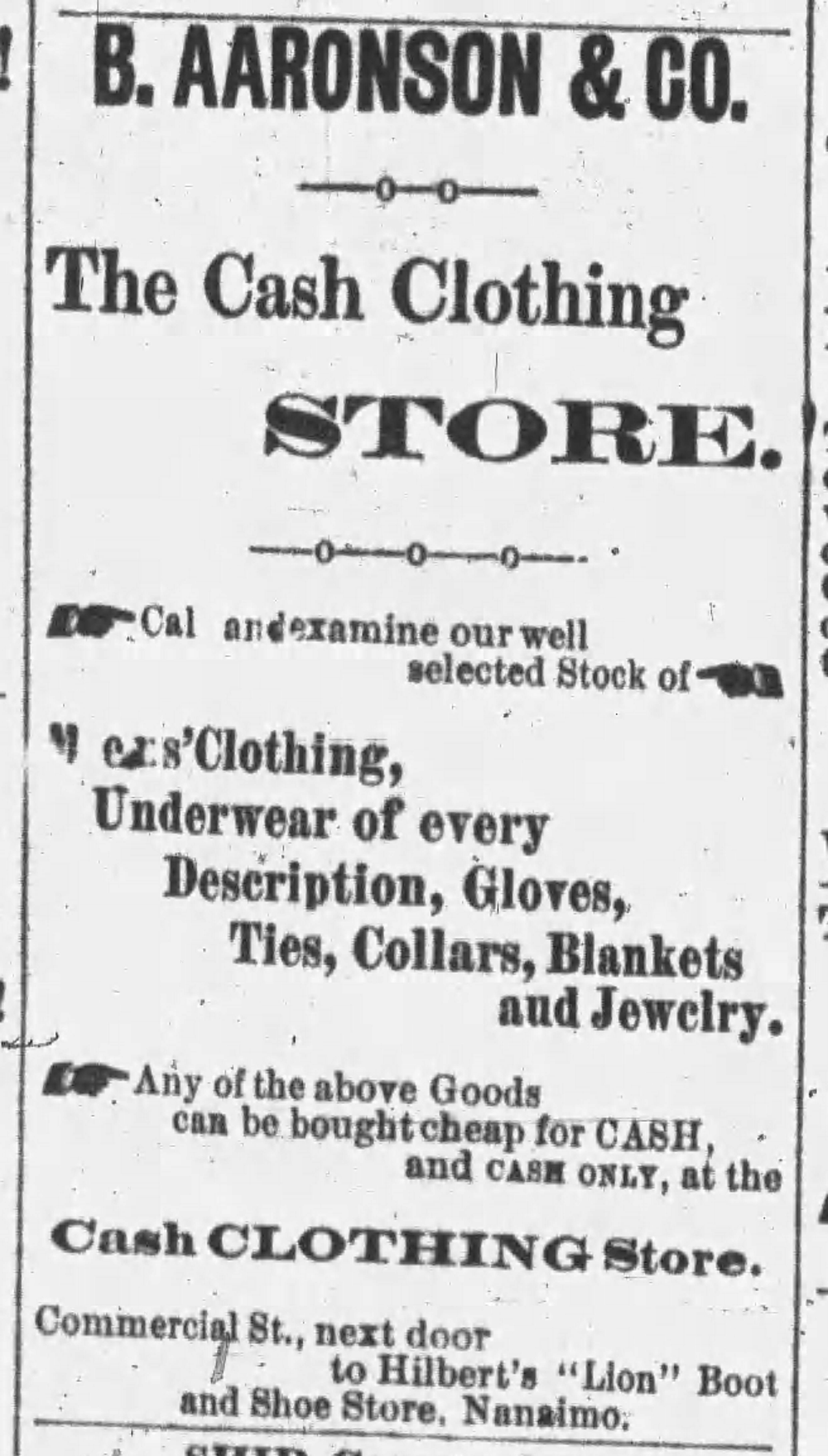 On October 11, 1889, the Nanaimo Daily News reported that “The store of B. Aaronson & Co Clothiers of Commercial street was closed yesterday and on inquiry we learned that the firm had made an assignment for the benefit of the creditors, who are mostly eastern firms. The liabilities are placed at $3,000. No further particulars are obtainable.” (The article is posted above.)