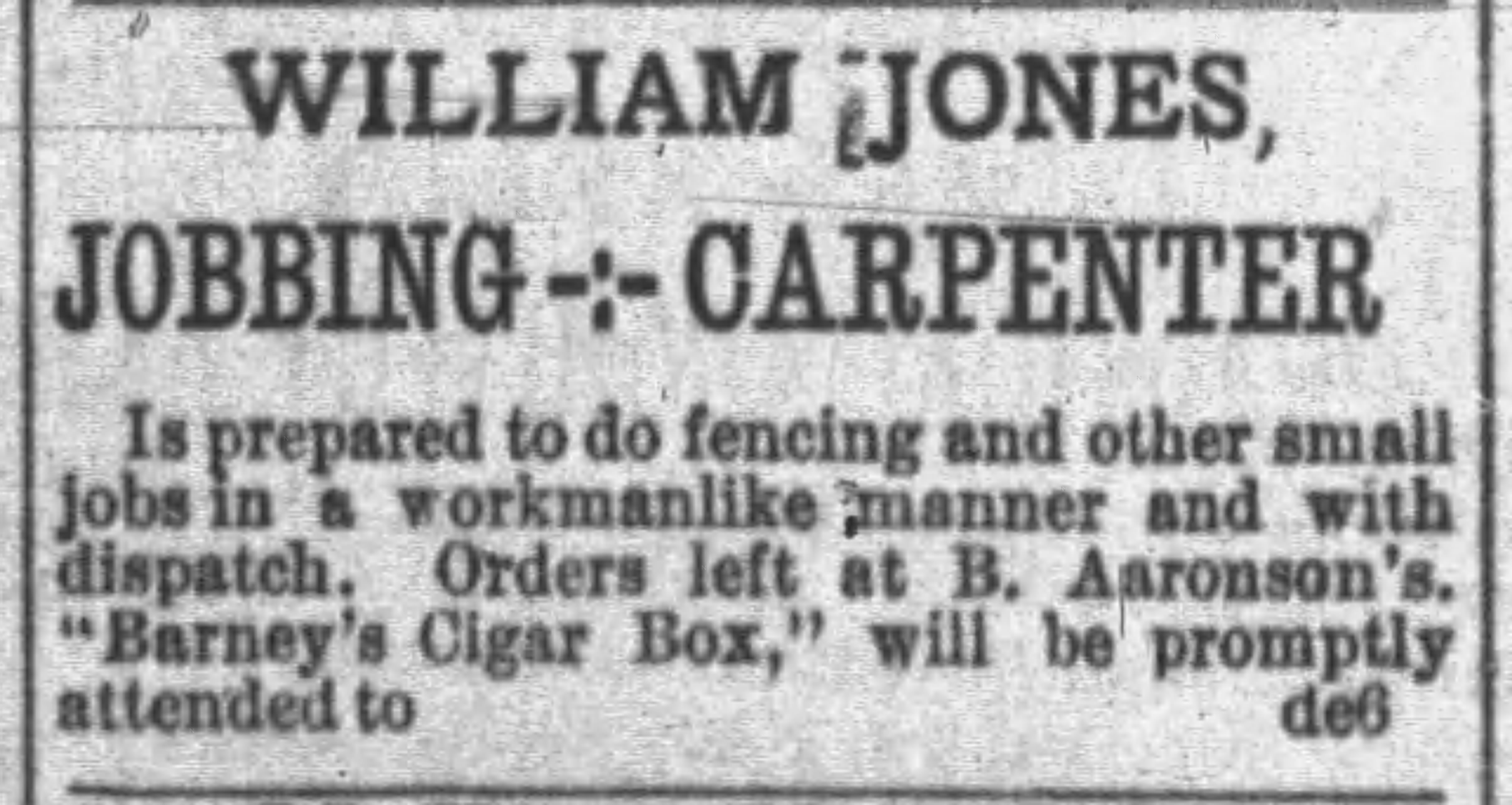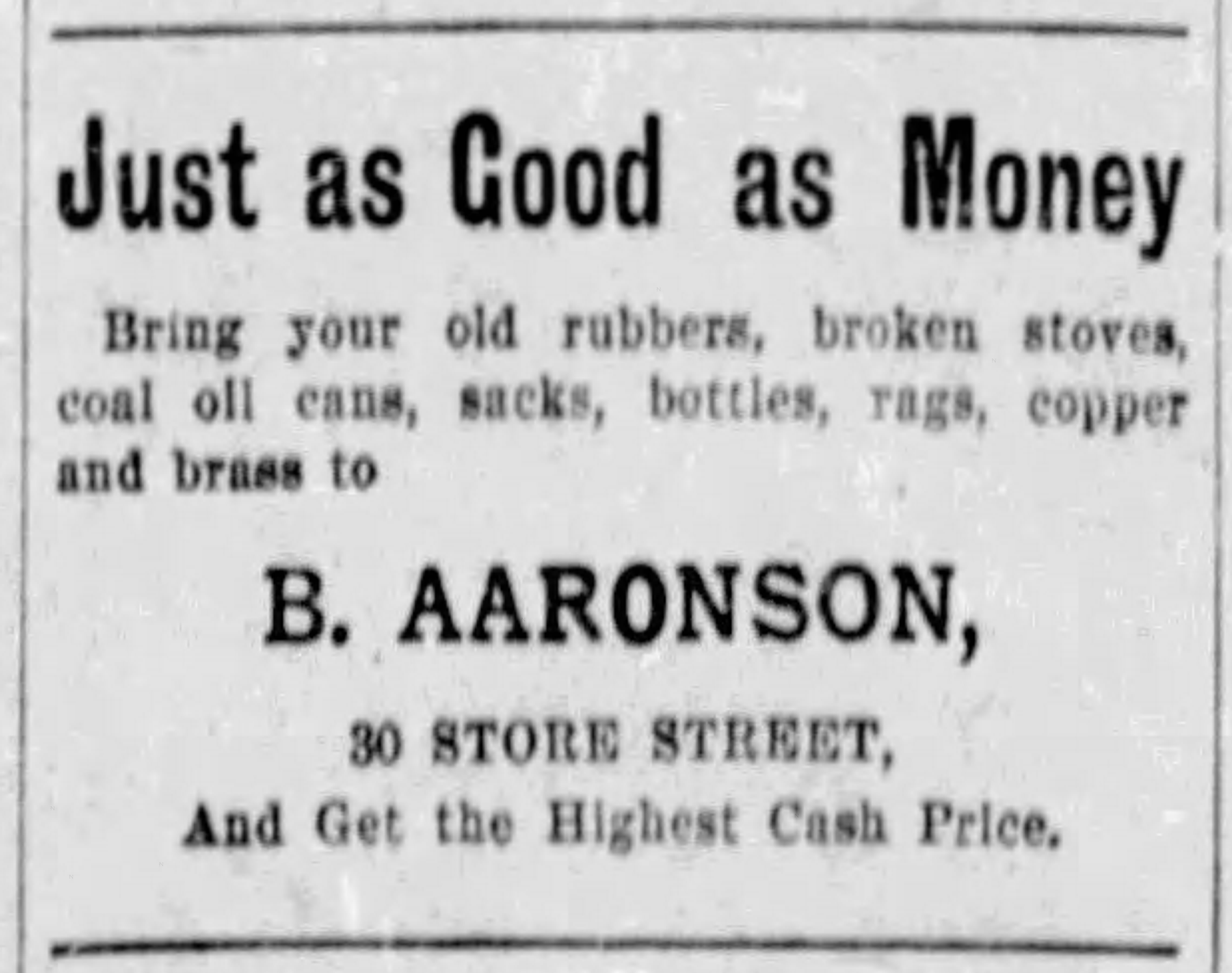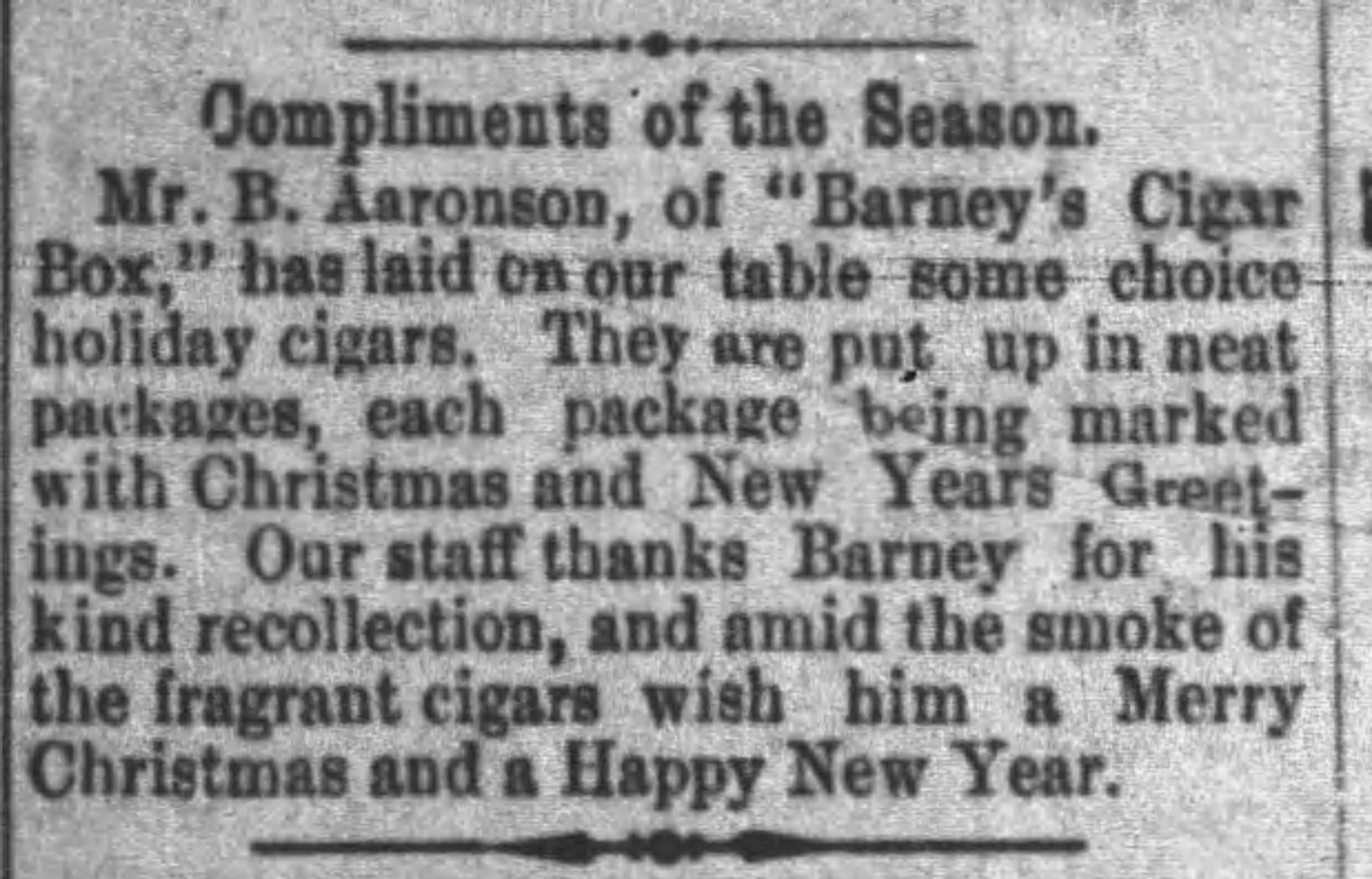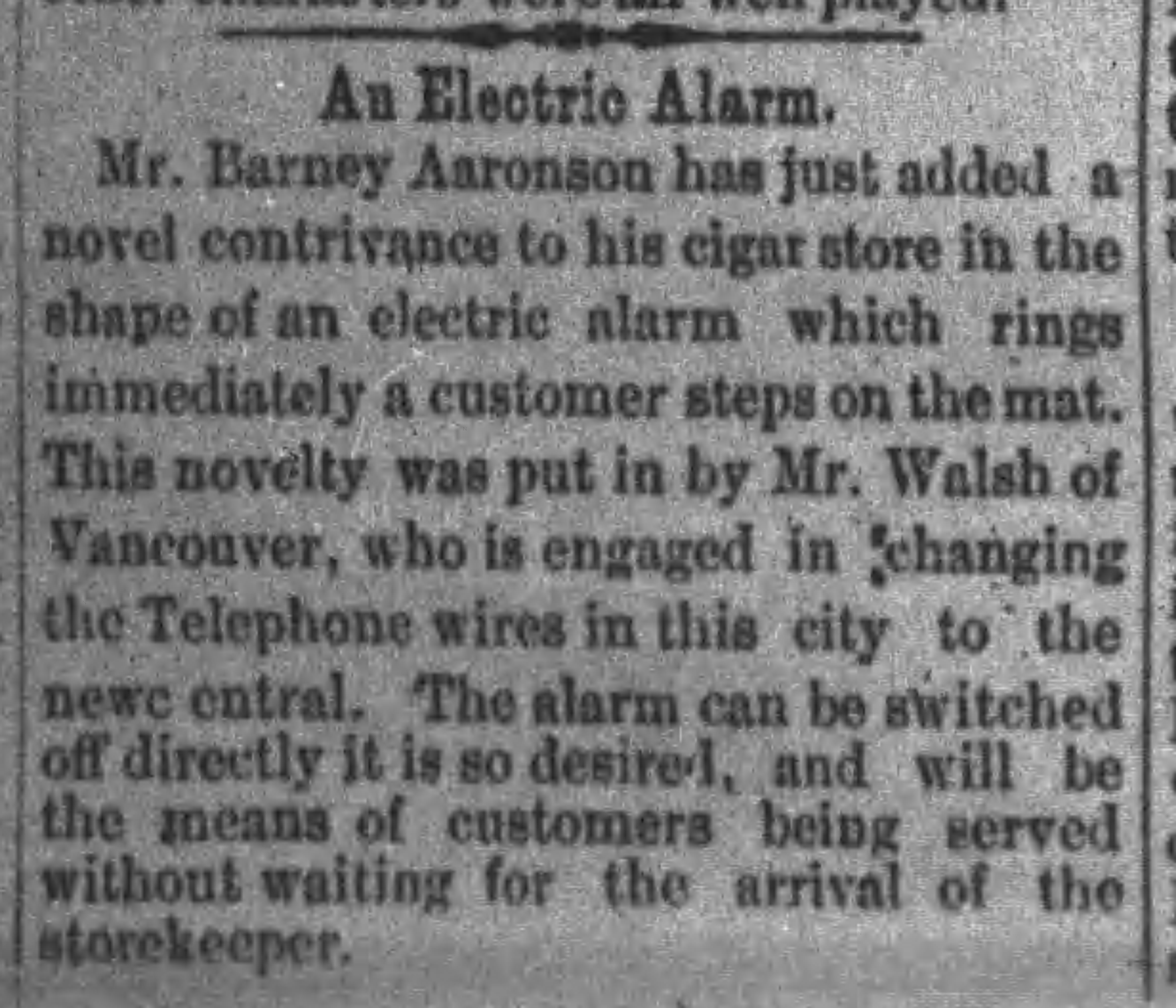On October 14, 1890, the paper reported that “Mr. Barney Aaronson has just added a novel contrivance to his cigar store in the shape of an electric alarm which rings immediately when a customer steps on the mat…The alarm..will be the means of customers being served without waiting for the arrival of the storekeeper.” (The article is posted above.)