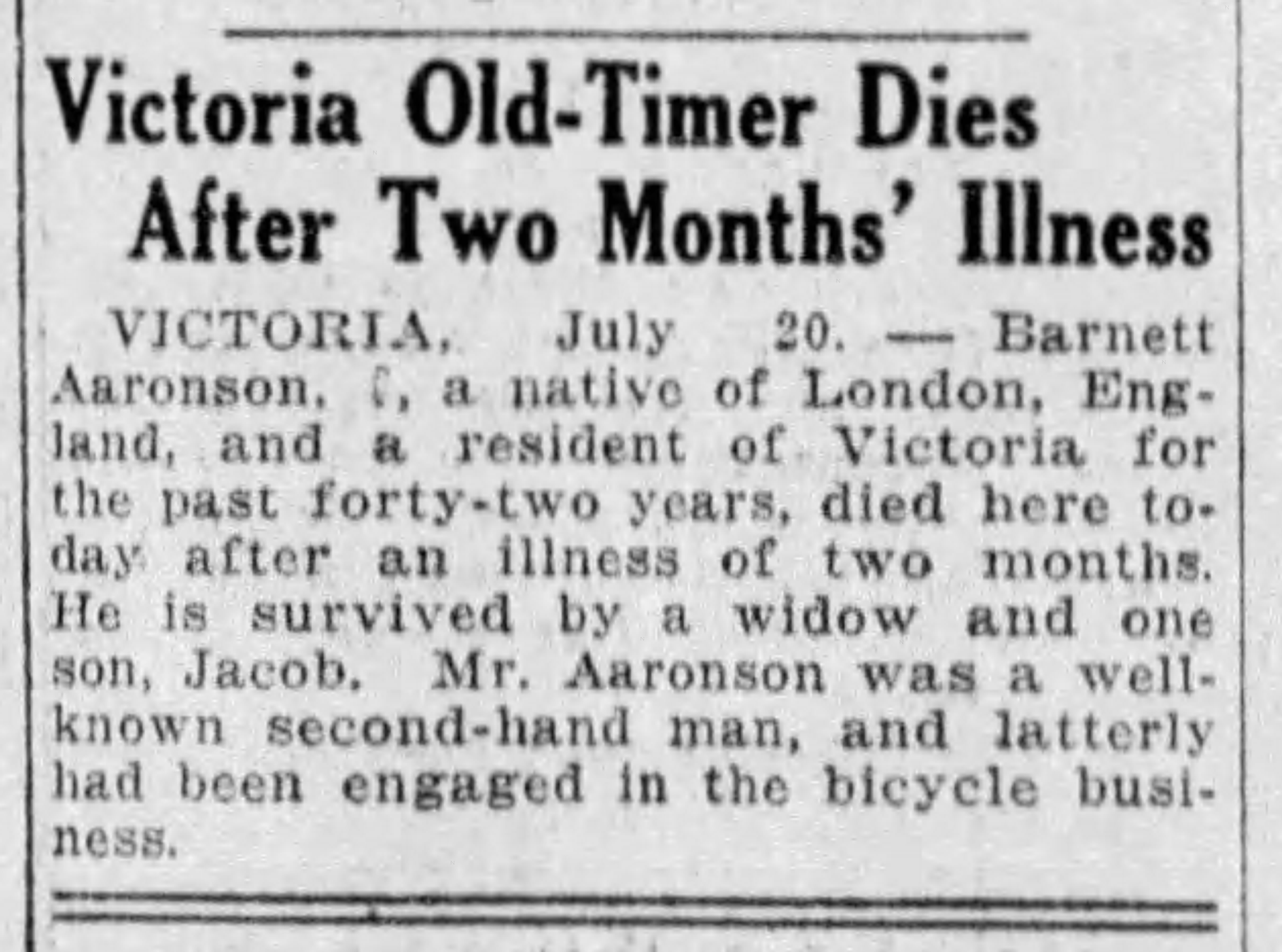 Barney worked at the junk store at 30 Store Street, either as the manager, clerk or proprietor from 1898-1920. In 1908, the location changed from 30 Store to 1620 Store Street. In 1920, Barney was working at the City Bargain Store located at 565 Johnson Street. Barney opened and became the proprietor of Aaronson’s Hardware Store located at 565 Johnson Street in 1922. According to the Victoria City Directory, Barney was still working there in 1925, the year before he died. His obituary noted that by the end of his life, Barney was in the bicycle business.