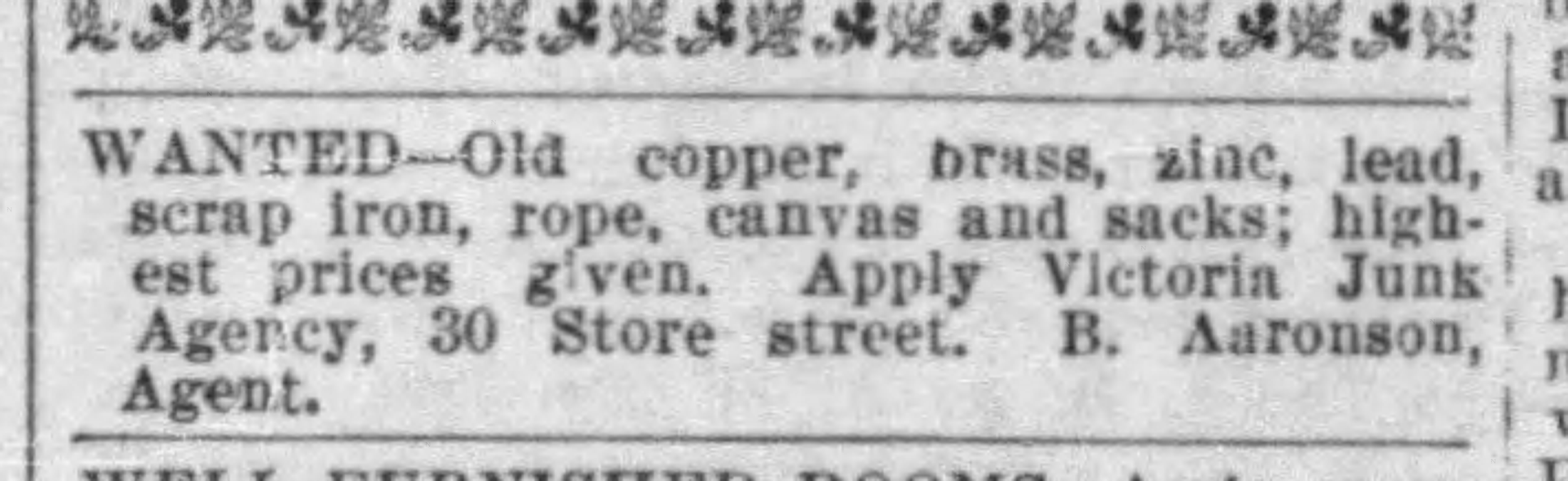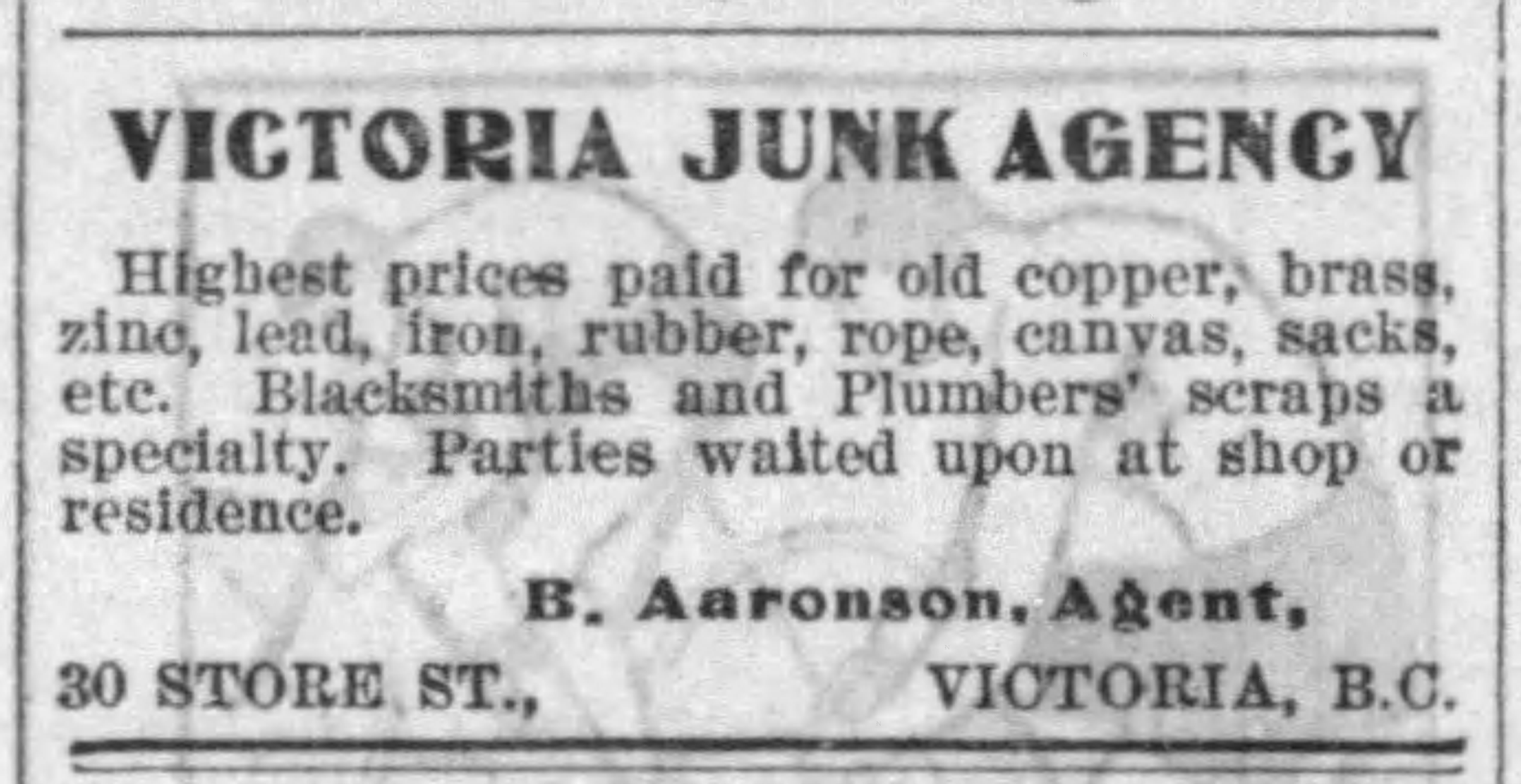 Barney’s slightly older brother, Alfred Andrew “A.A.” was listed as a pawnbroker in the Victoria City Directory in 1881. Barney’s name first appeared in the Victoria City Directory in 1898. His occupation was listed as junk dealer at 30 Store Street. The 1901 Canada Census noted that Barney could speak English, but not French. It listed Barney as earning $1,000 as an employee of the Victoria Junk Store. By that time he had divorced.