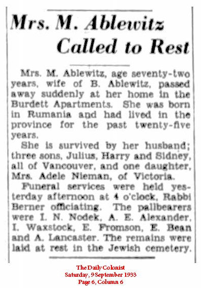 Mrs. M. Ablowitz, age seventy-two years, wife of B. Ablowitz, passed away suddenly at her home in the Burdett Apartments, Victoria. She was born in Roumania and had lived in the province for the past twenty-five years. She is survived by her husband, three sons, Julius, Harry and Sidney all of Vancouver, and one daughter, Mrs. Adele Nieman, of Victoria. Funeral services were held yesterday afternoon at 4 o’clock. Rabbi Berner officiating. The pallbearers were I. N. Nodeck, A. E. Alexander, and A. Lancaster. The remains were laid at rest in the Jewish cemetery.