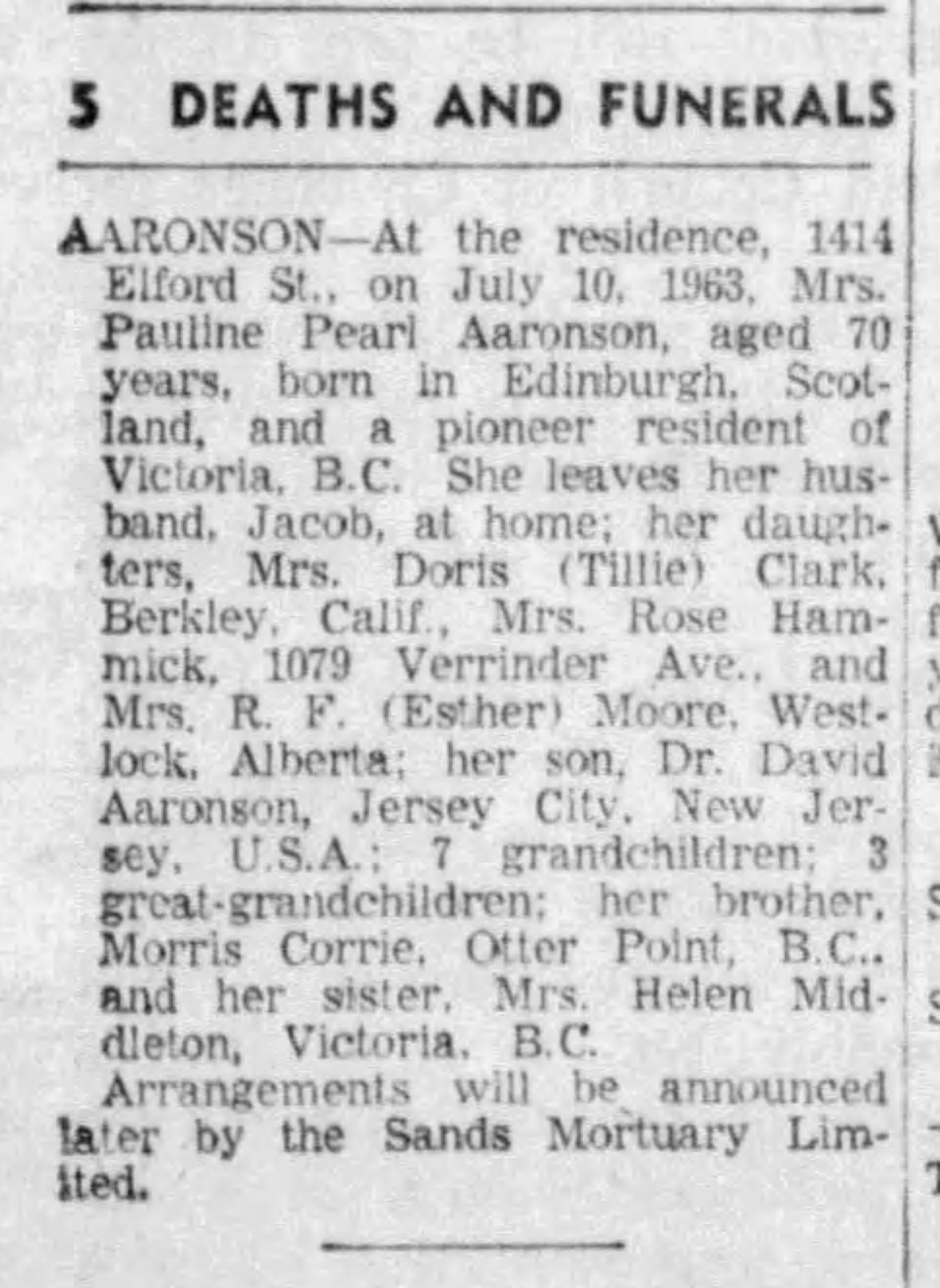 However, Pauline was in Alberta in 1914 as it is there that she gave birth to her daughter Tilly D. Aaronson. Pauline married Jacob Lewis Aaronson (1884–1972) in Victoria on August 31, 1919. Their second child, Rose M Aaronson, was born in 1920 and their son David Andrew Aaronson, (1921–1989) was born on November 20, 1921 in Victoria.