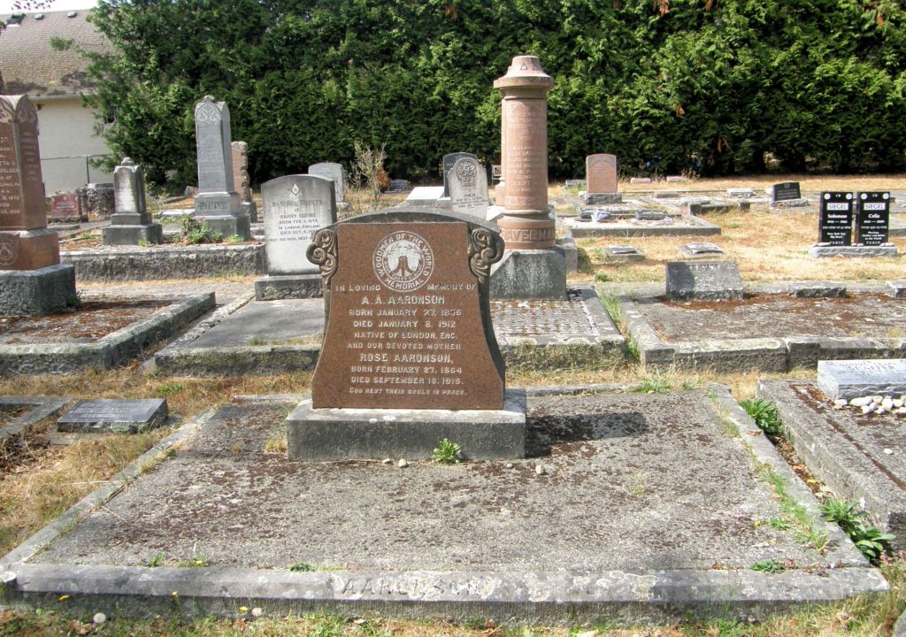 According to Rachel’s obituary, her remains were buried in the Jewish Cemetery in Victoria, however no marker is visible. There is a family-sized plot with the name Aaronson etched into the curbing. For a time, it was the custom for only the curbing to be engraved as an indication of whose remains had been buried. Marker stones were not necessarily used during this time, and none exists for Hannah. It is very likely that Hannah, her mother, and her father were all buried in this plot.