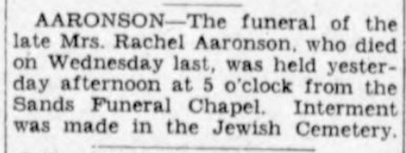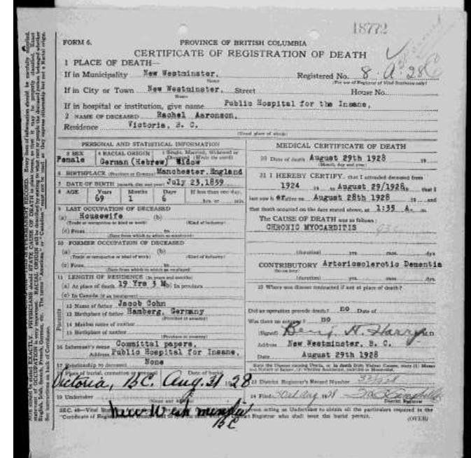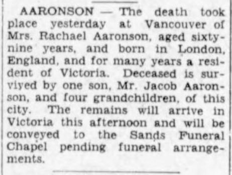 What is known is that Rachel married Barnett Aaronson (1857–1925) on August 1, 1882 in London, England. Rachel gave birth to Hyman Harry Aaronson (1883–1902) in Chelsea, London, England on July 2, 1883, to Jacob Lewis Aaronson (1884–1972) in Chelsea, London, England on August 22, 1884, and to Hannah Aaronson (1886–1916) in Victoria, B.C., on June 14, 1886.