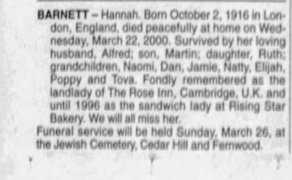 When I asked Alf and Martin for Anne’s Hebrew name they told me that all the girls in her family were named Hannah, supposedly after an uncle in Poland, Alf thought. We remember the biblical Hannah for uttering the first recorded prayer. We read in her story how the rabbis misunderstood the movement of her lips, thinking Hannah drunk, when really she was utterly absorbed in her prayerful petitions. Anne, Hannah bat Moshe v’Sophie, was not religiously inclined, but the depth of emotion she showed at Nati’s Bar Mitzvah belies an abiding feeling for her Jewish roots.
