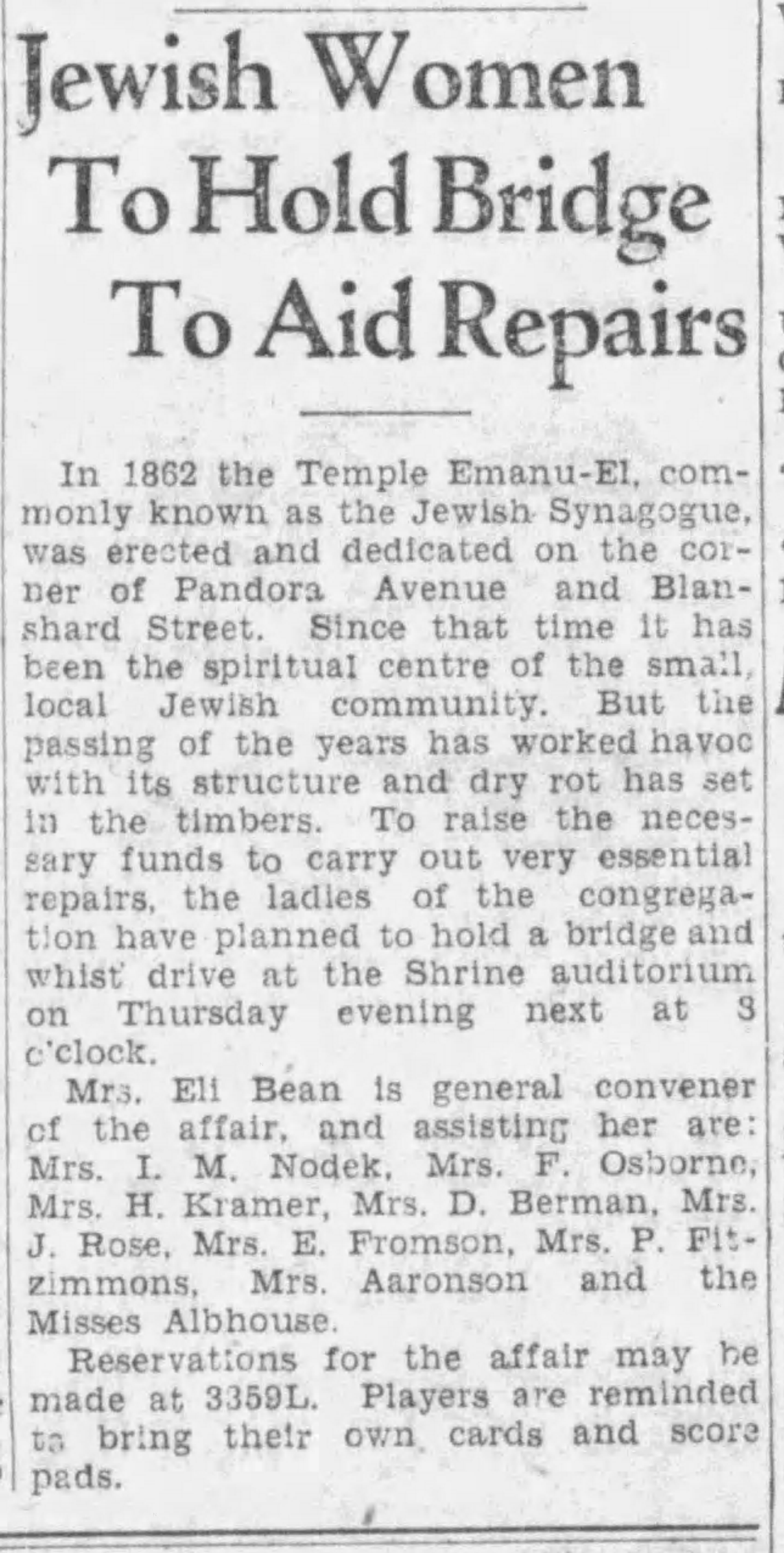 The Victoria Daily Times on October 18, 1930 reported that the “passing years” since the synagogue was built in 1862 had “worked havoc with its structure and dry rot has set in the timbers.” In response, the “ladies” of the congregation held a special event to raise money for the repairs. Bridge and whist matches were scheduled. Reservations were expected and players were asked to bring their own cards and score pads. Mrs. E. Bean was the general convener.