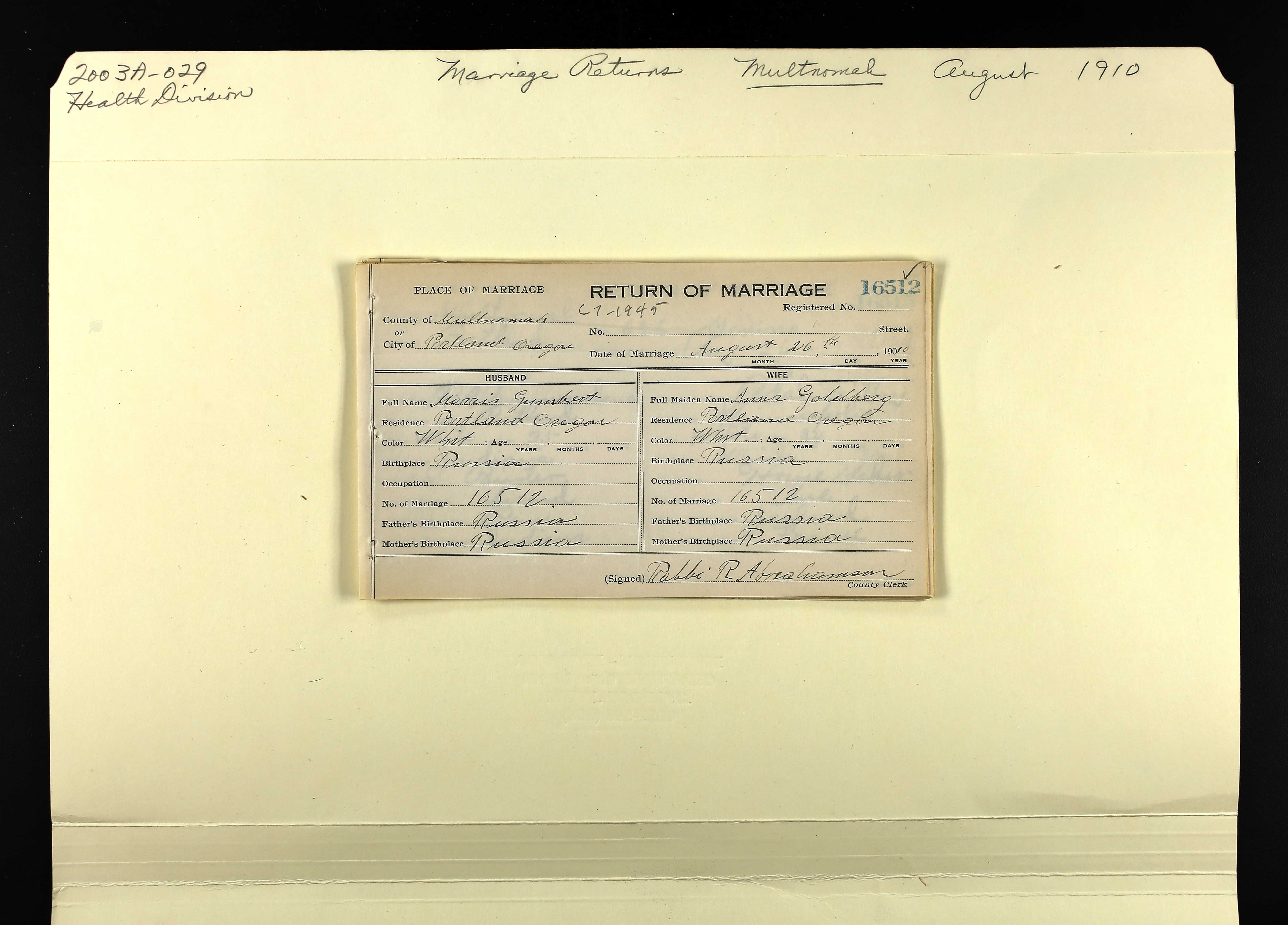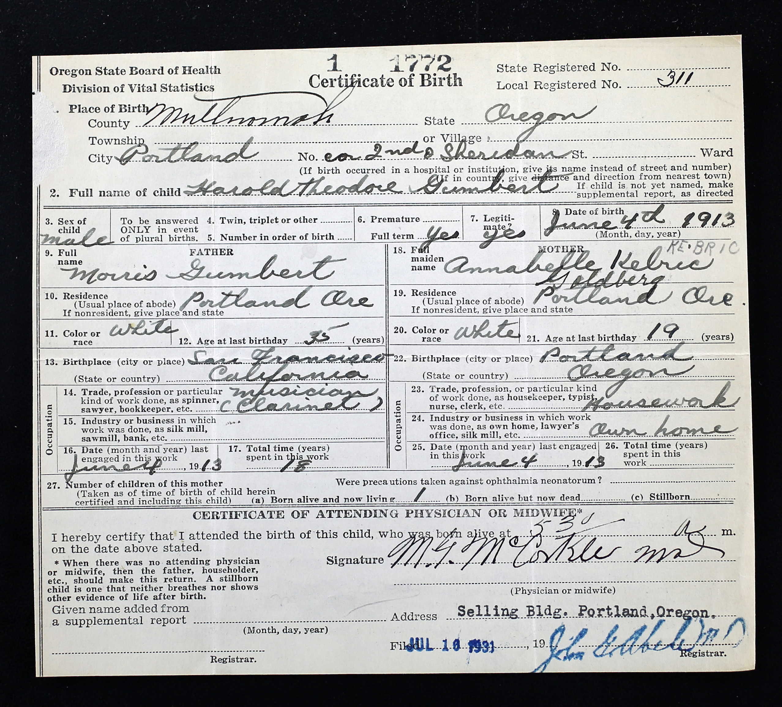 Annabelle married the clarinetist Morris Gumbert on August 26, 1910 in Portland. Their son, Harold Theodore Gumbert, was born on June 4, 1913. Annabelle’s name was listed on his birth certificate as Kebric Goldberg. Morris died in Portland on October 18, 1920.