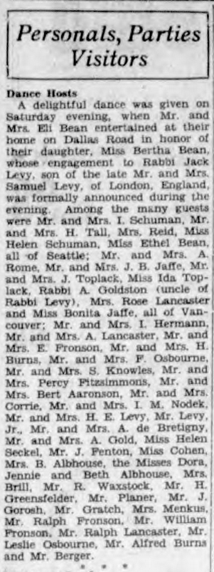 Annabelle hosted a number of parties that were described in the press, including a “very enjoyable New Year’s party” for 1925 at the family’s home on Wellington Avenue. On January 8, 1929, the Daily Colonist reported that Annabelle hosted a party at their home on Dallas Road to announce the engagement of their daughter Bertha to Rabbi Jack Levy. The Who’s Who of the Jewish community attended.