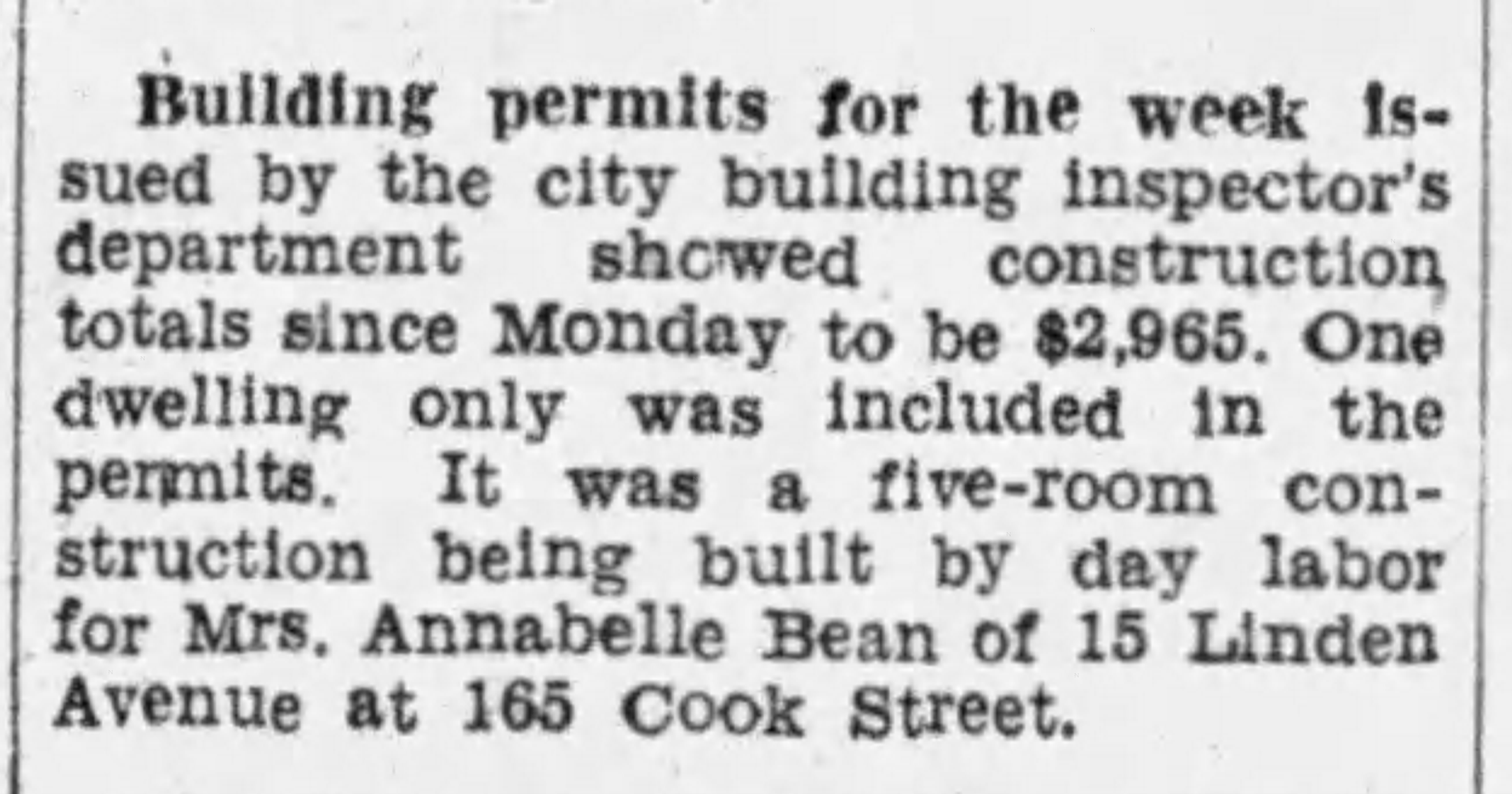 The Victoria Daily Times reported on March 9, 1935 that the city inspector issued a building permit to Mrs. Annabelle Bean for the construction of a five-room house to be built at 165 Cook Street at a cost of $2,965.