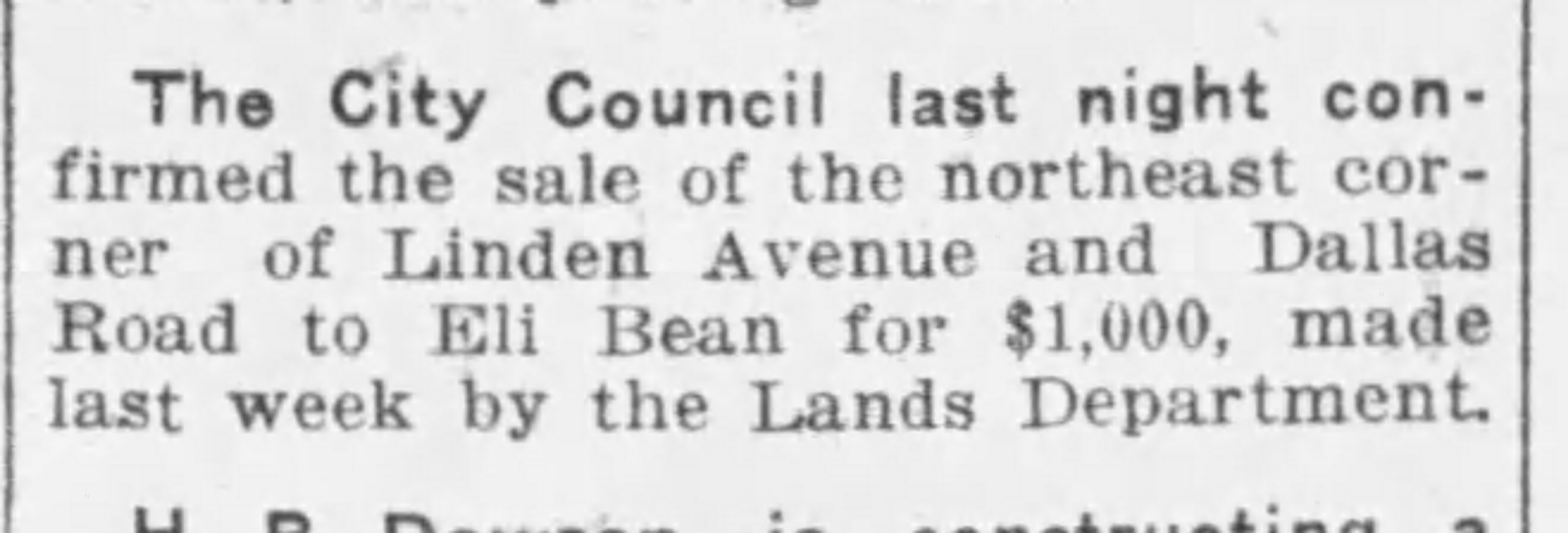 The Bean family lived at different addresses on Dallas Road, Wellington Avenue and Hollywood Crescent before Eli purchased a plot on the Northeast corner of Linden Avenue in May 1925. According to the Times Colonist on May 27, 1925, the property was sold for $1000.00. By 1935, the home address for the Bean family was listed as 15 Linden Avenue.