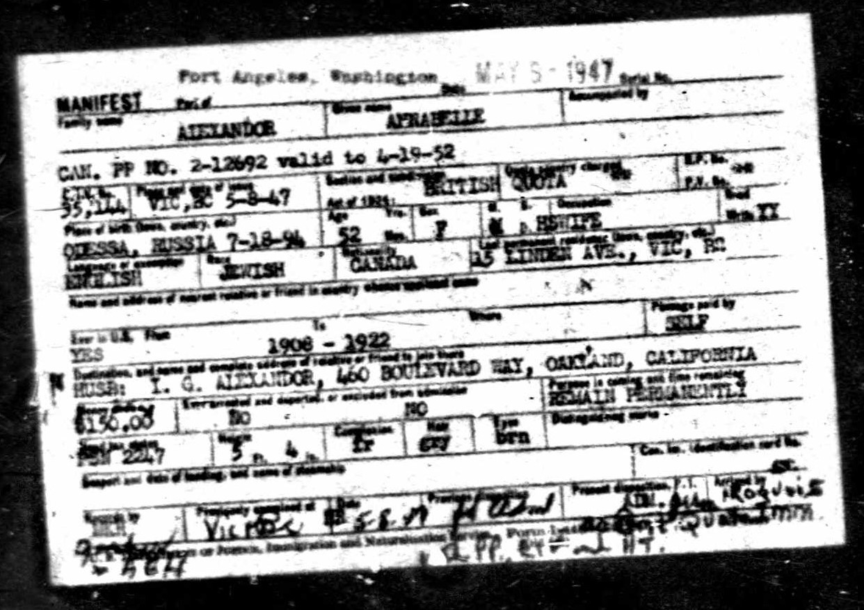 Eli died on February 22, 1940. On September 1, 1944, the Times Colonist reported that Annabelle travelled to Vancouver to attend the wedding of A.E. Alexandor‘s daughter Evelyn to Harry Weiner. A.E.’s brother Isaac “I.G.” Alexandor, of Berkeley, California was also in attendance. Annabelle and Issac had a small wedding in Victoria’s synagogue on December 25, 1945. According to the Victoria Daily Times, only immediate relatives were present. Following the ceremony, a lunch was held at the Royal Dominion Cafe, and a few guests were entertained at dinner at the Empress Hotel in the evening.