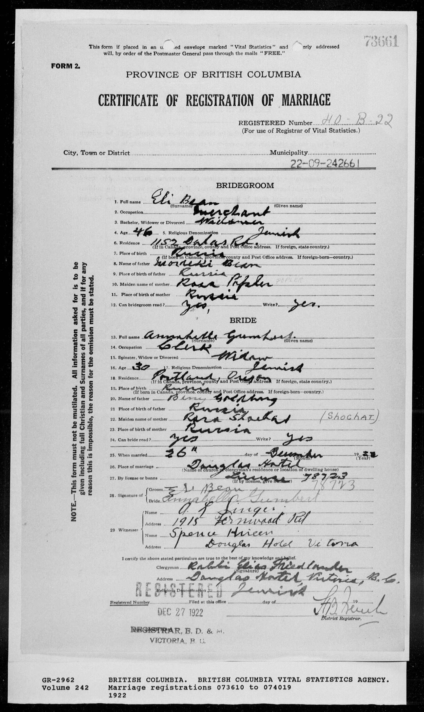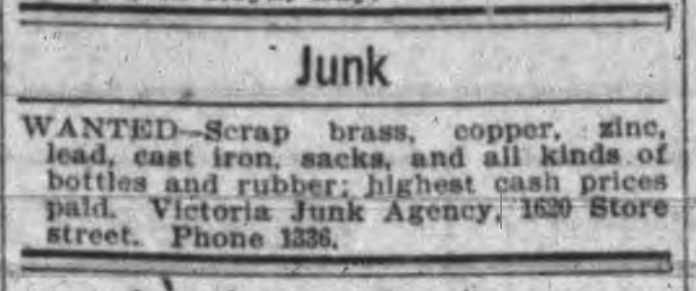 According to a passenger list, Eli lived in Bellingham, Washington for five years. In 1911, at the age of thirty-eight he immigrated to Victoria from there. Two years later his name appears in the Victoria City Director. He is listed Eli as the manager of the Great Western Junk Company (1421 Store Street) . In 1914 he was employed as the proprietor of the rival Victoria Junk Agency (1620 Store Street). Between 1913-1922, Eli lived in six different locations, including a year at the Metropolis Hotel (Located at 706-718 Yates Street, designed by George C. Mesher and opened in 1913).
