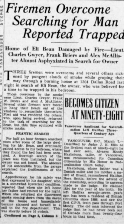 In 1928, his daughter, Esther, was listed as student at Vic College living with her father and Annebelle on Dallas Road. In 1930, son Harold was listed at the same address on Dallas Road and was a salesman for Spencer’s Department Store.