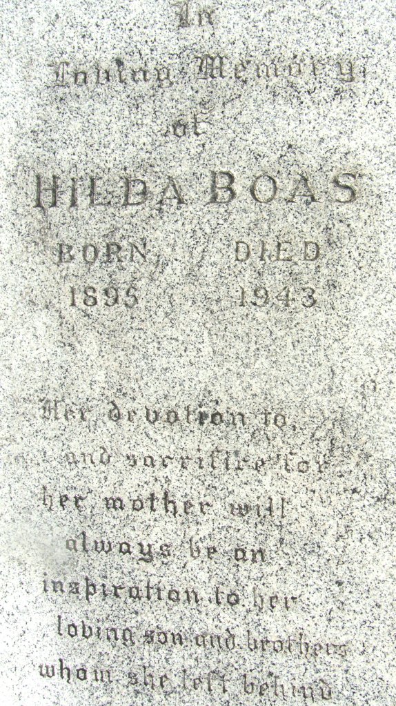 By the 1910 U.S. Census, the family was living in Fairbanks, Alaska. The Boases owned several businesses. After a May, 1911 fire near their clothing business, the family moved from Alaska and settled in Seattle. By 1920, Hilda’s brother, Alfred, had moved out of the house. Hilda’s father owned the Emporium Department Store in Seattle. Her brothers, Max and Martin worked at the store.