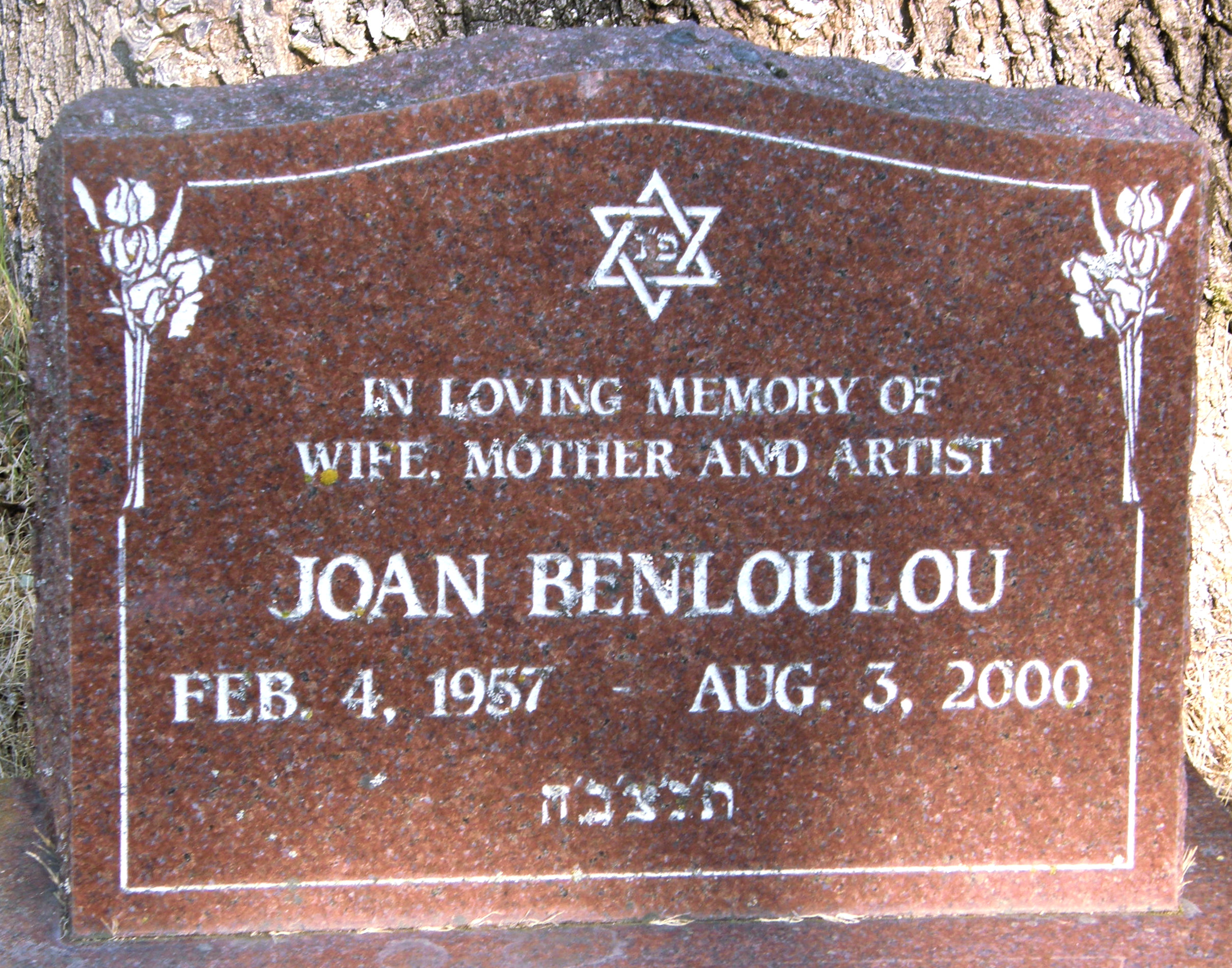 This stone also marks the source of much of Joans’ joy while she was here in this lifetime – her art. Her favourite flower, the Iris, is now carved in stone, once filled with vibrant colours is now rendered in the red of granite.