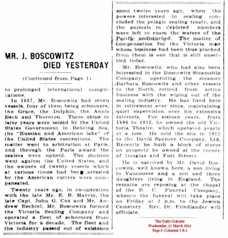 By 1871 Joseph Boscowitz had stores in Clayoqout Sound, Northern Vancouver Island and in Washington State. Along with partners including sea captains, Joe Boscowitcz formed the Boscowitz Steamship Co. By 1886 his company was a leader in the sealing industry and was operating a fleet of steam schooners. Joe Boscowitz owned three ship including the Barbara Boscowitz, which was named after his eldest daughter. The schooners sailed the North Pacific and Bering Sea, catching pelagic seals and selling their pelts in Victoria, San Francisco, New York and London.