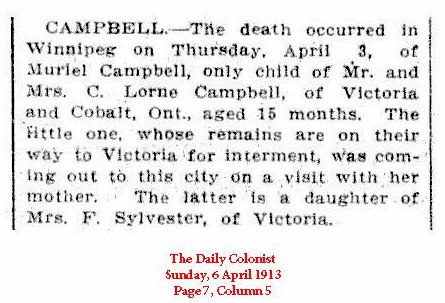 The information confirming the burial and biographical details is from the Daily Colonist newspaper for Sunday 06 April 1913 Page 7 Column 5; Tuesday 08 April 1913 Page 7 Column 5 and Manitoba Vital Statistics.