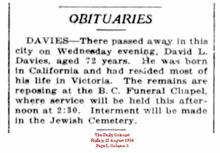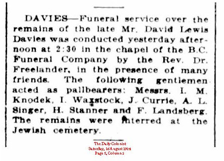 The information confirming the burial and biographical details is from Congregation Emanu-El Burial Register 1946 as related through the JewishGen Online Worldwide Burial Registry (JOWBR)and the death notice published in the Daily Colonist newspaper for Thursday 14 August 1924 Page 14 Column 1.