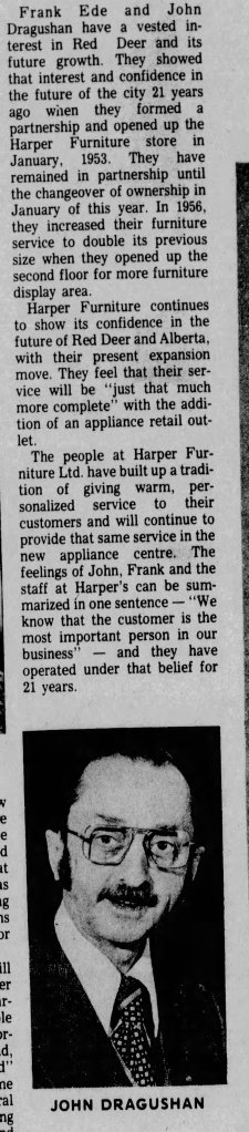 then travelled west in search of a business to buy. He purchased a furniture store for sale in Red Deer, Alberta, which was the catalyst for their move to that community in 1953.