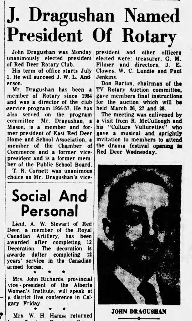 In Red Deer, John was President of the Rotary Club, Vice President of the Chamber of Commerce, President of the Downtown Business Association, and a member of the public school board. He was known throughout the area as an honest and fair businessman by his loyal customers.