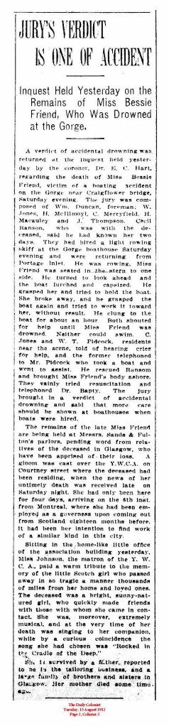 She had only been in Victoria for a few months after arriving from Montreal where she had been a governess. At the time of the accident which killed her, she was residing at the YMCA and was hoping to find a job as a governess in Victoria.