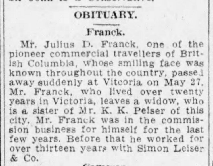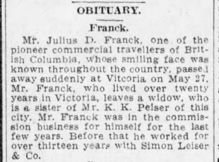 Julius became a travelling salesman for the Simon Leiser & Co in about 1908. In 1909 a manager at Simon Leiser & Co. charged Julius with fraudulently appropriating $2,000.00 and property from the firm. The Victoria Daily Times covered the story extensively in February and March 1909. (articles posted above). The case was eventually remanded, postponed and rescheduled a number of times before it was withdrawn altogether by the prosecution “on humanitarian grounds as doctors agreed that the excitement attendant of the trial would almost certainly be fatal to Mr. Franck who is in the last stages of diabetes.” Julius’ lawyers consistently maintained that their case was strong, but acquiesced to the prosecution’s petition and the case was ultimately dismissed.
