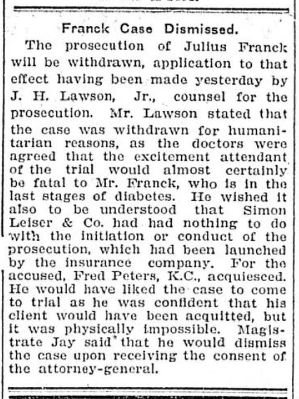 According to the March 14, 1909 edition of The Daily Colonist, “Mr. Franck wanted it known that Simon Leiser & Co had nothing to do with the initiation or conduct of the prosecution which had been launched by the insurance company.”