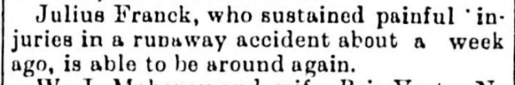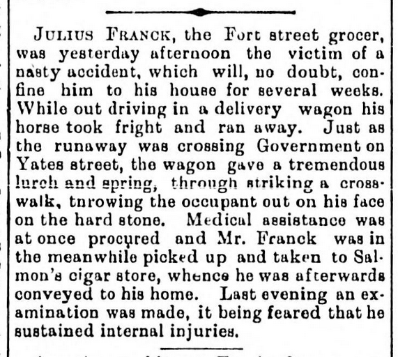 The Victoria City Directories listed Julius as a bookkeeper for B. Gordon in 1892. The Daily Colonist reported on October 17, 1893 that Julius, then a grocer, had been badly injured of a “nasty” accident at the intersection of Government and Yates streets. Julius was driving delivery wagon when his horse became spooked and the wagon lurched, throwing Julius to the ground. Reports of the accident ran in the paper for a few days.