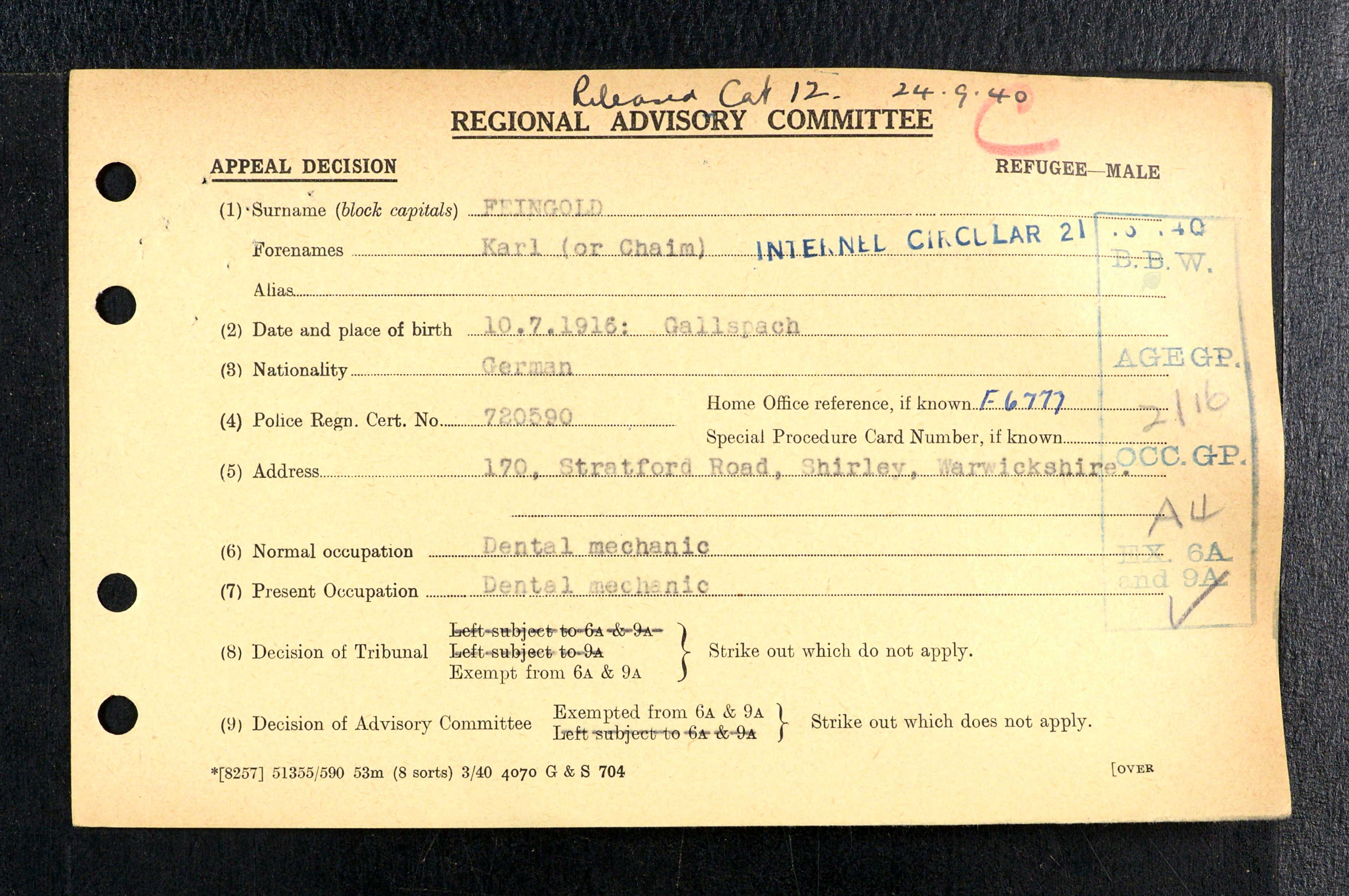 Birth: June or July 10, 1916 in Gallspach, Grieskirchen, Upper Austria, Austria