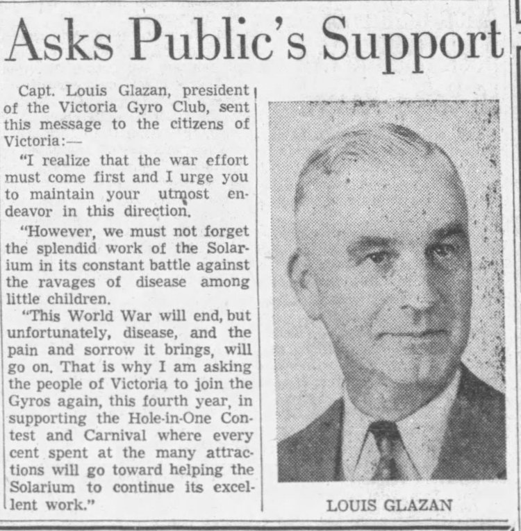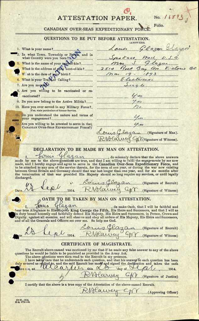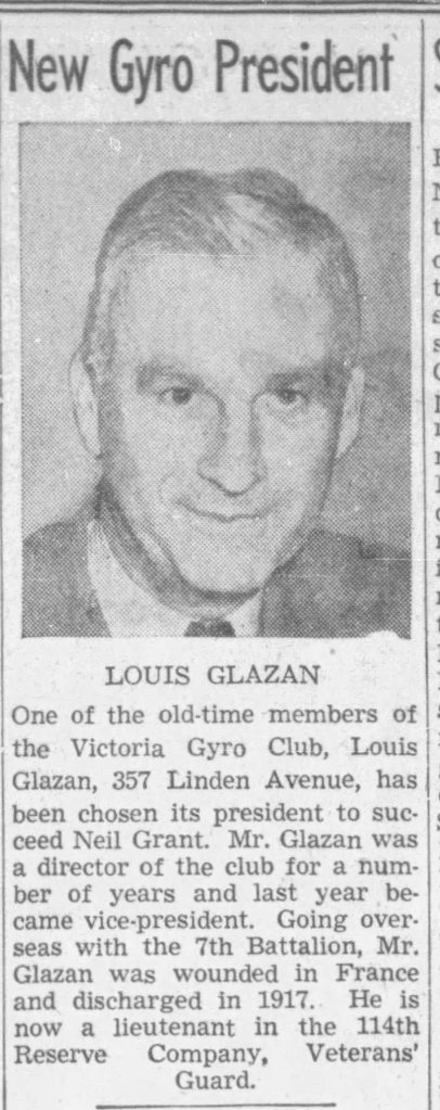The January 26, 1917 edition of Victoria Daily Colonist reported that Pte. Louis Glazen went to war on August 1914 with the PPCLI, dispatch. He was injured which made him unfit for service. Louis was the first Jew from Victoria to return from the war.
