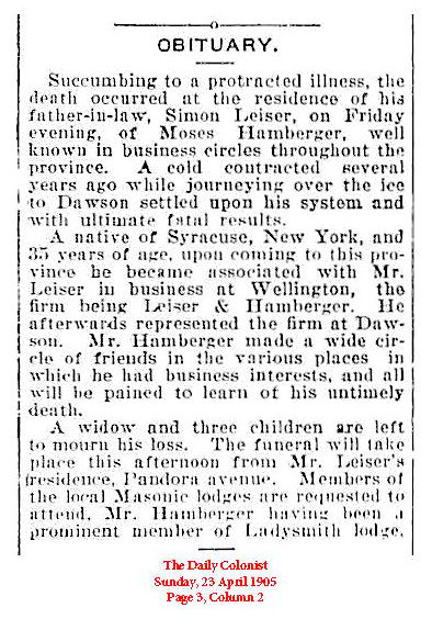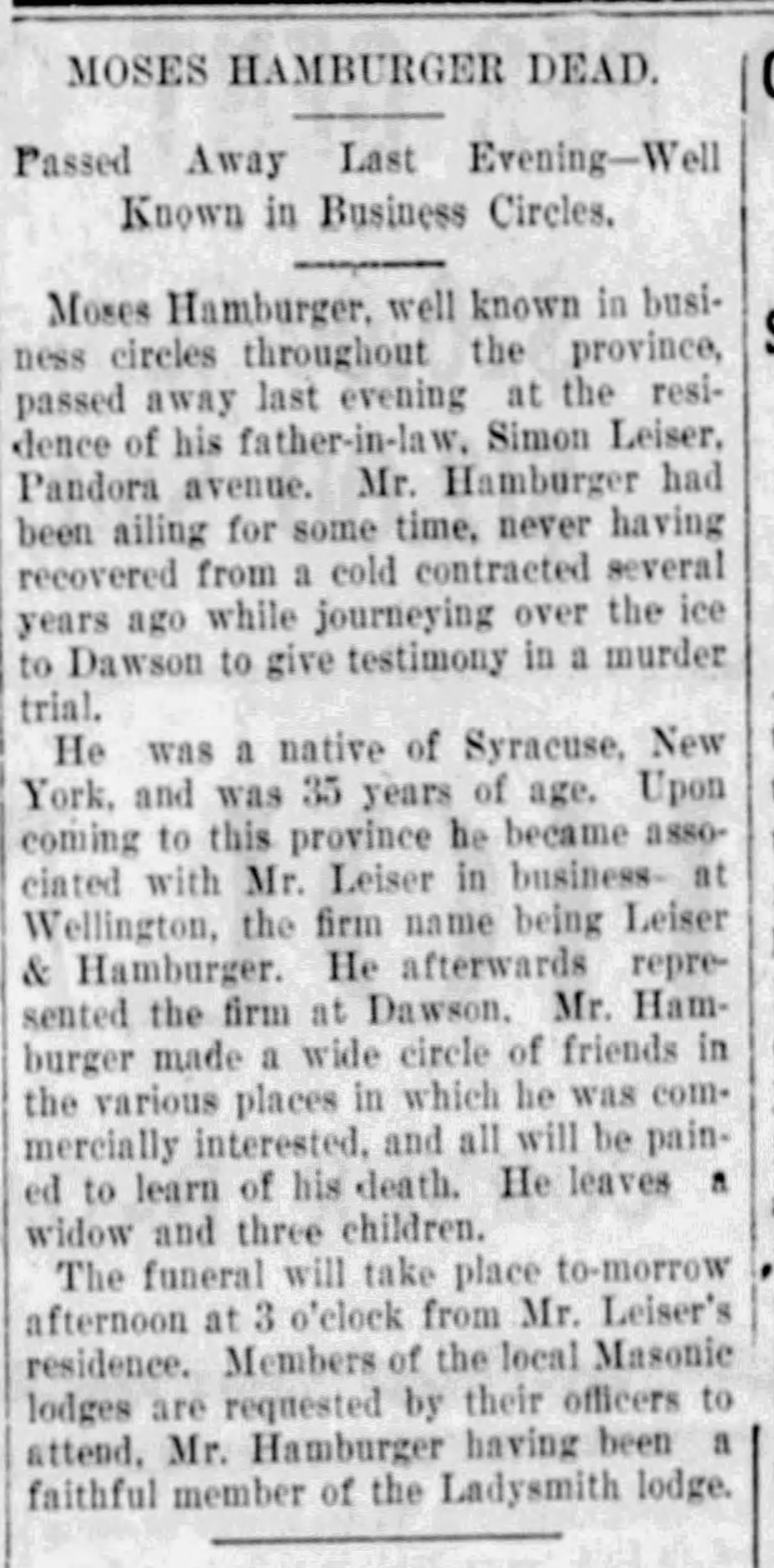 Morris died at the age of 35 on April 21, 1905 at Simon Leiser’s home. The Daily Times reported that Morris had been ill for ‘some time’. His illness was blamed on a cold that he got while traveling over ice to Dawson. He made the trip so that he could give testimony at a murder trial.