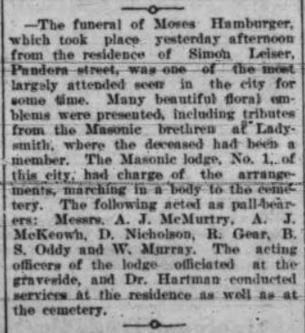The funeral for Morris took place at the home of Simon Leiser. It was well attended. Numerous bouquets of flowers were sent. Many paid tribute, including members of the Masonic Lodge in Ladysmith. Victoria Lodge No.1 lead a march to the cemetery where Masonic rites were given. Dr. Hartman conducted the Jewish services both at the residence and at the cemetery.