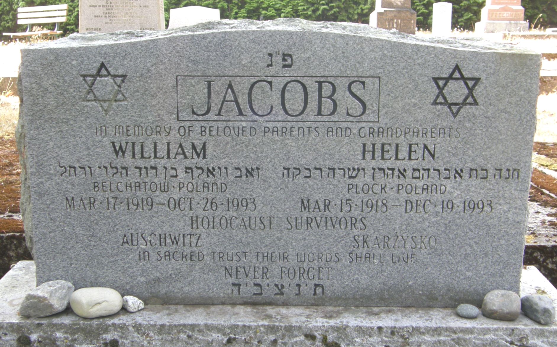 The most important role that Willie played here, in the far-flung reaches of galut, of exile, was that of witness and survivor. Here, in seemingly providential fashion, he was called to tell the survivor’s tale. It was a holy task. Willie was always available to speak. He never said no. He travelled tirelessly, rising again and again above the pain of memory in order to remember and tell the tale. In hushed teenage classrooms Willie spoke with towering dignity, calmly sharing the deepest pain and shame and pride and rage. He would roll up his sleeve and calmly show the ghastly number on his arm, proof in his flesh of the horrors he had known. There would be silence and tears and aching questions and awe. Students would come up to him when he finished and simply hold his hand and say. “thank you.” They sent cards that he treasured. He brought the students into his world. If there was any doubt, he unmasked for them the racist lie of hate-mongers and deniers and their pitiful defenders. Willie was to speak today, at this very hour, with students on Thetis Island. When Michael Peters called and asked Willie to come to Thetis Island, Willie said “Where?” and to Michael’s repetition Willie said, “Where’s that?” Immediately Willie then said “Oh never mind. I’ll go anywhere to speak. Just take me there.” Little did he or we know that he had another meeting to keep. Willie and Helen’s long time and dear friend, fellow survivor, Rysia Kraskin said, “We lost a man who did a lot for us, who educated non-Jewish kids about what we went through. I don’t know who will do it now. He was never too busy.” Willie spoke with our Hebrew School children and our youth. On Yom HaShoah, Holocaust Memorial Day, he spoke to us from that monument, but the gate of the cemetery, which he passionately laboured to build and give to our community. It was his mitzvah, a memorial stone for the 6 million. Now it is a mitzvah for him as well, even as his soul joins the souls of the martyrs whose memory he honoured.