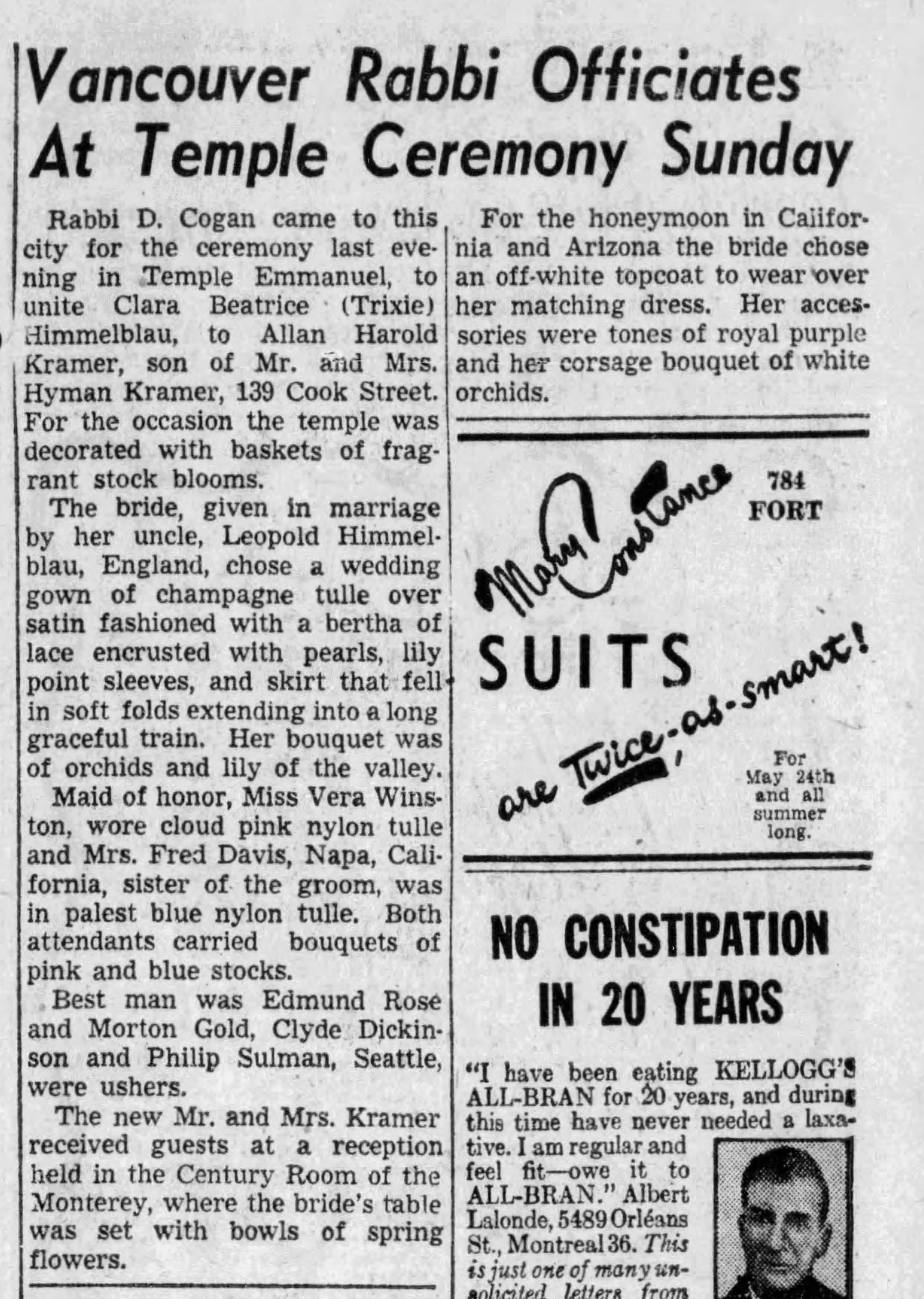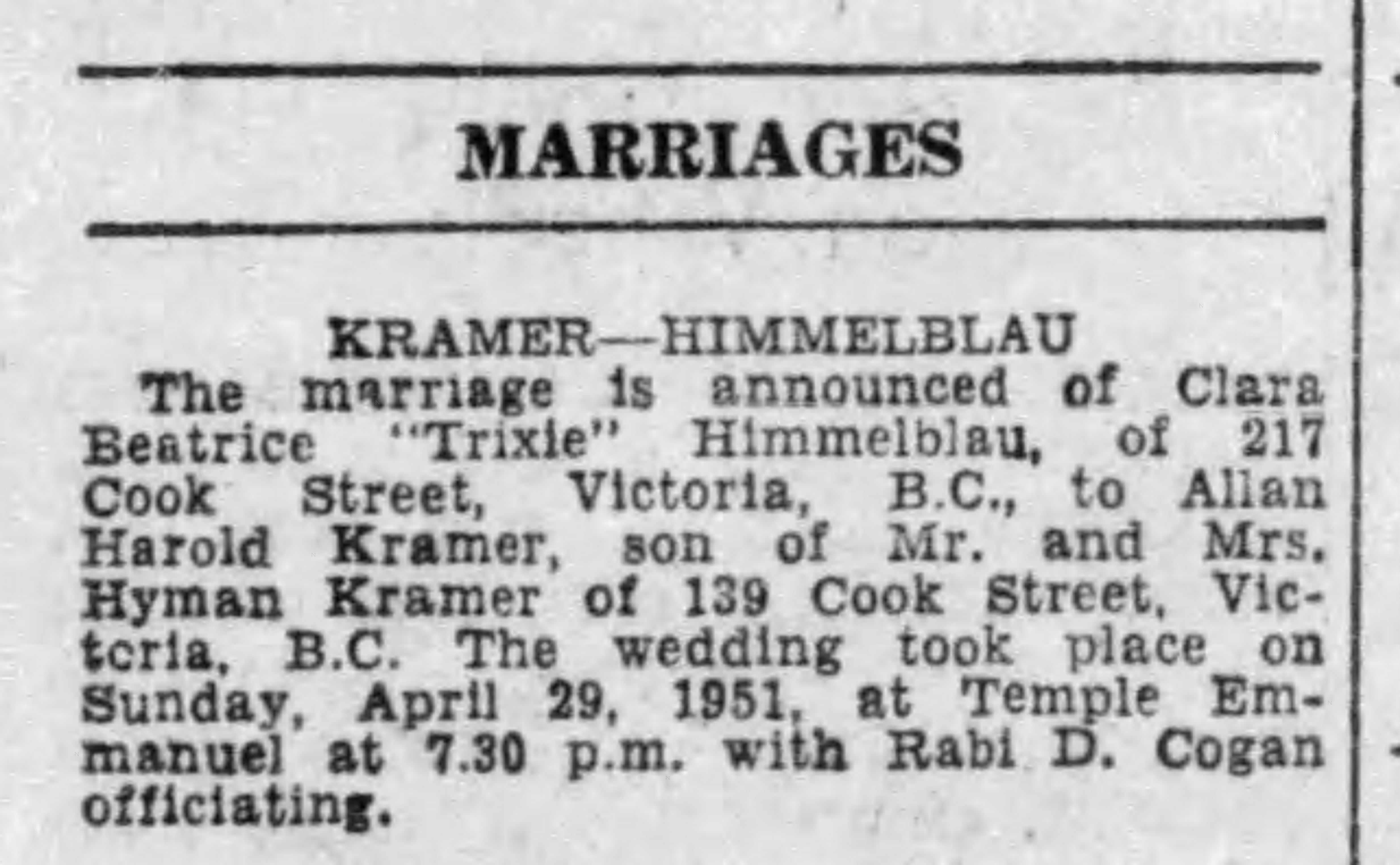 Allan and Clara Beatrice Himmelblau married on April 29, 1951. The 1968 Voters List showed Allen and Clara living at 1239 Union Road in Esquimalt. Allen was listed as the manager of Totem Trailer Sales