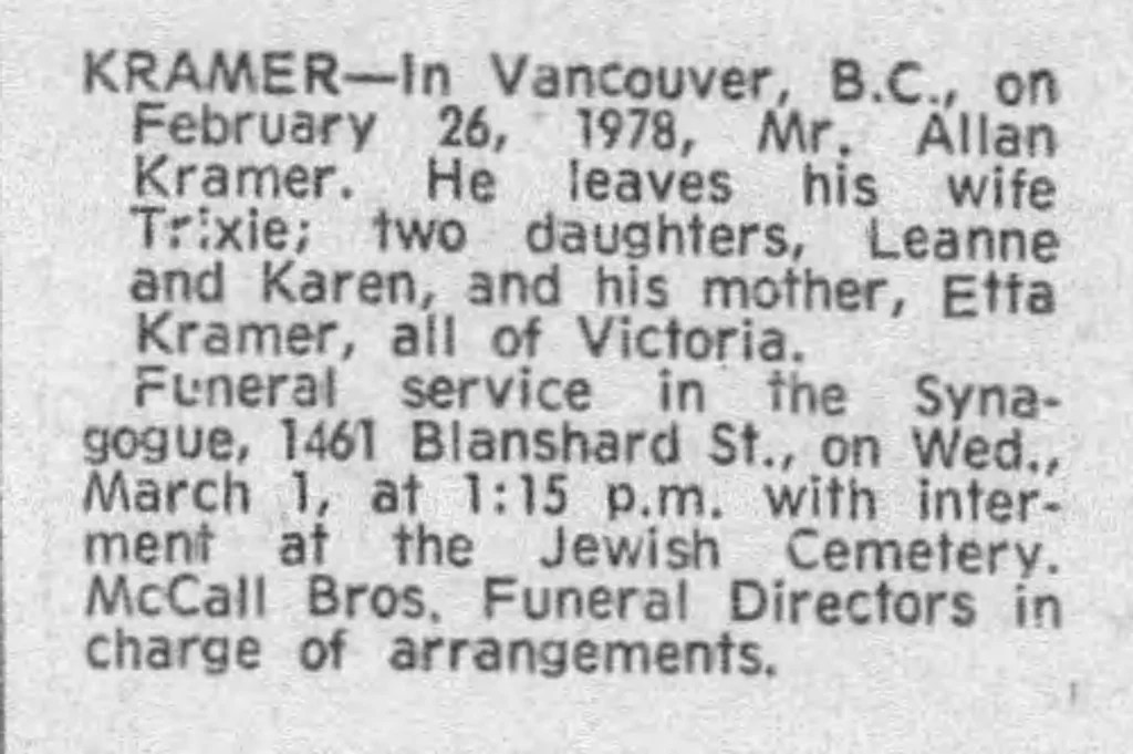 The grave marker gives Allan’s death date as February 26, 1978, but the British Columbia Death Registration 78-09-006116 gives it as February 27, 1978. The death occurred in hospital.