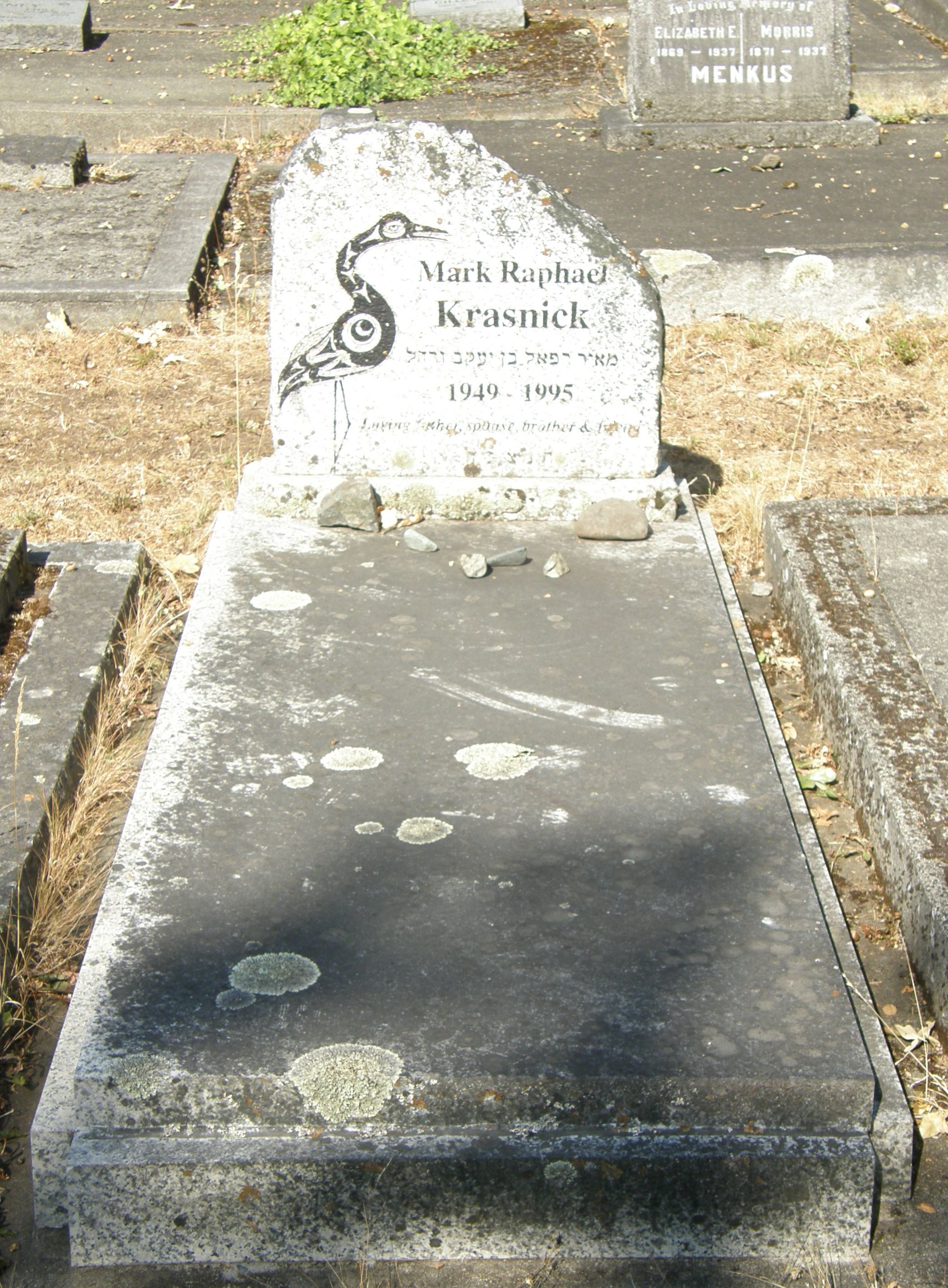Inscription: Image of Heron in First Nation motif on left side of stoneMark Raphael Krasnick מאיר רפאל בן יעקב ורחל 1949 – 1995 Loving father, spouse, brother & friend ת’נ’צ’ב’ה [on back] We think of Mark and all that his life taught us, and we realize how much we have lost and how much we have gained. Yesterday seems less painful, and we are not afraid of tomorrow