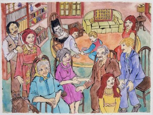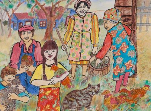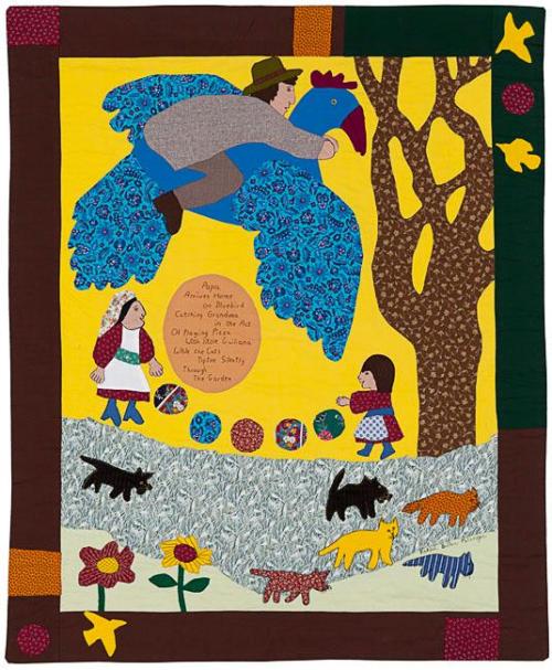 New York City-born cloth artist Rakhel Biller Klinger (formerly Biller-Klein) immigrated to Canada in 1966 and lived in Alberta between 1970 and 1990. Across her career she worked in a variety of media including woodcuts, watercolours, and also in quilted cotton, wool, and felt (as exemplified in the hand and machine applique and machine-embroidered AFA Collection artwork “Bluebird” from 1992). She says that her overall aesthetic aim is “to express my delight in the people, animals, birds, and landscapes that have touched my life—to bring these images together in colourful, tactile, well-composed pictures that will hopefully bring a smile and a bit of fun into their viewers’ lives.”