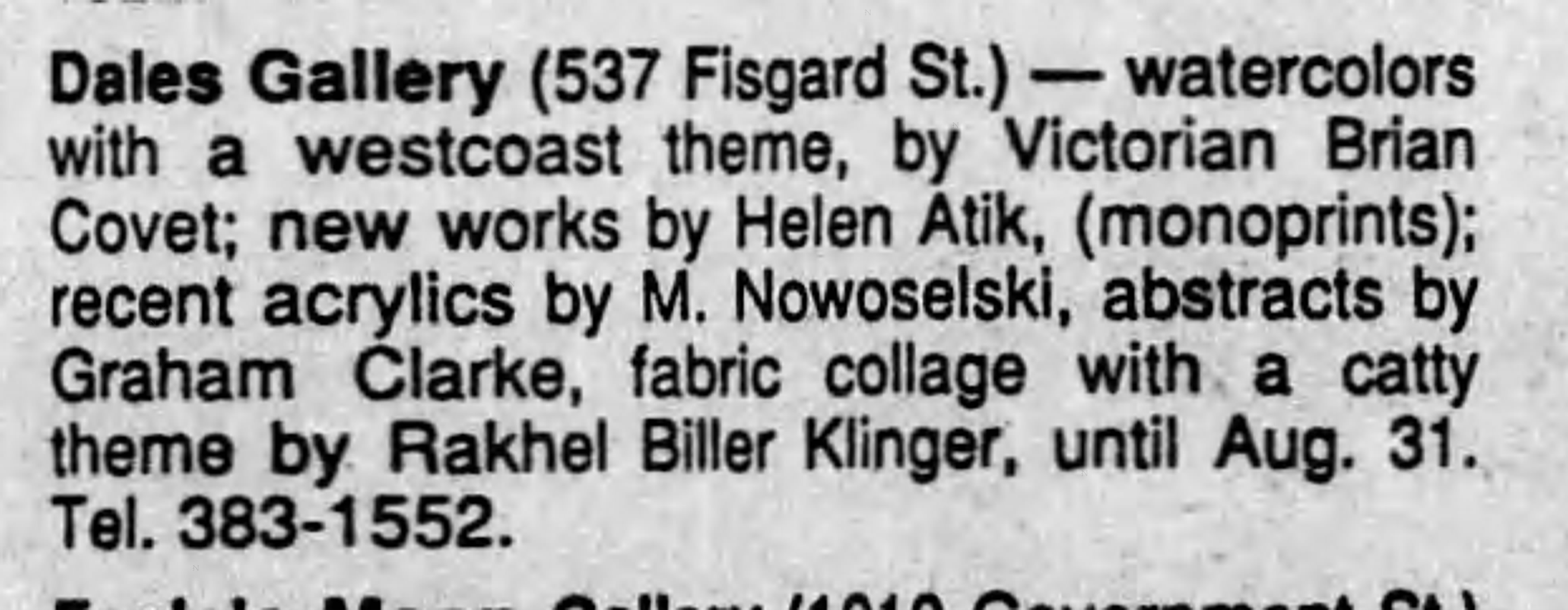 Several corporate and public collections house Biller Klinger’s work, including those of Duggan School and Athabasca University in Edmonton, the Winnipeg Art Gallery, the Montreal Museum of Fine Arts, and the Canada Council Arts Bank.