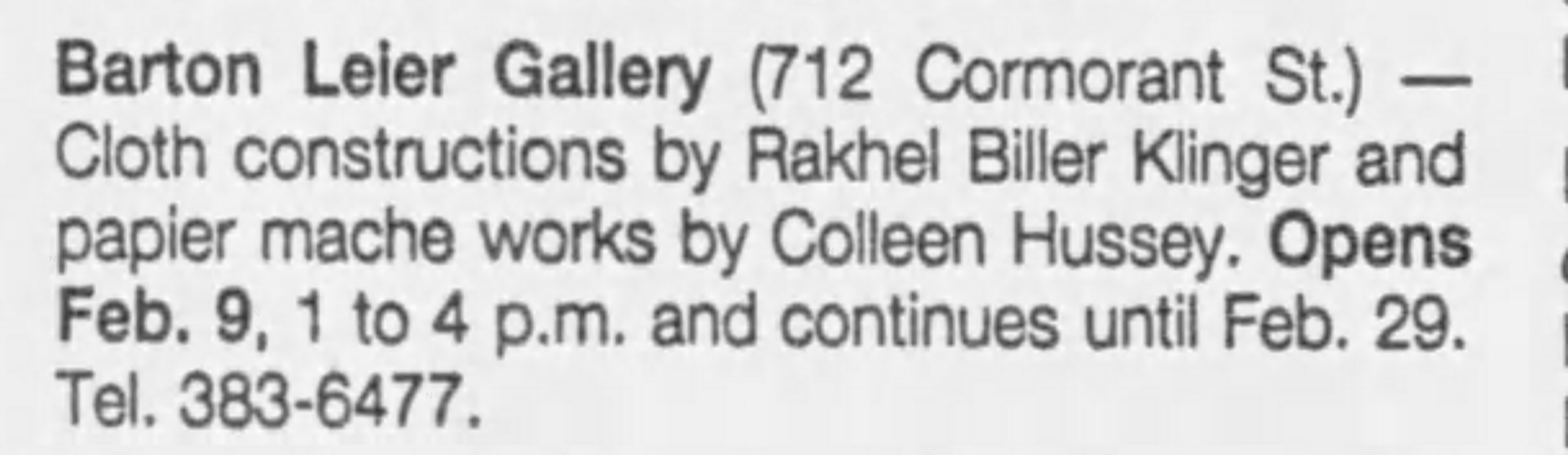 After studying at Syracuse University in New York (1957 – 1959) and the University of Minnesota at Minneapolis (1961 to 1963) for her Bachelor of Arts in Arts Education, Biller Klinger staged solo exhibitions at a range of locations including the Jerusalem Artists Centre in Israel, the Winnipeg Public Art Gallery, and the Kilbride-Bradley Gallery in Minneapolis, and participated in group shows at Universiade (1983 University Games) in Edmonton, the Nickle Arts Museum in Calgary, and the Barton-Leier Gallery of Victoria, BC.